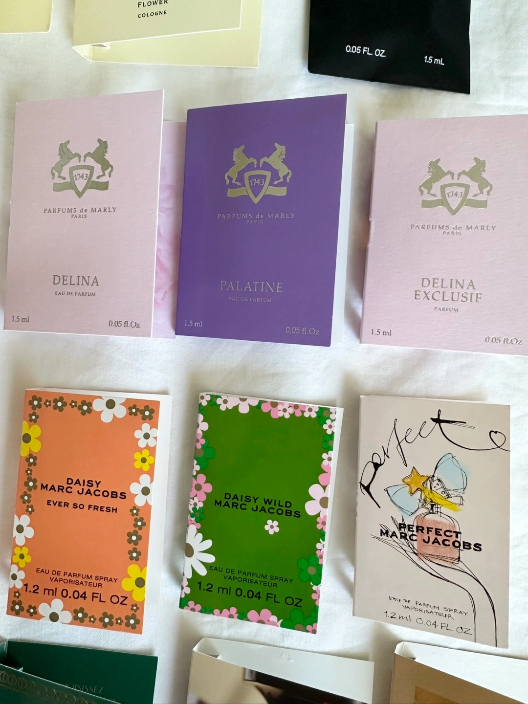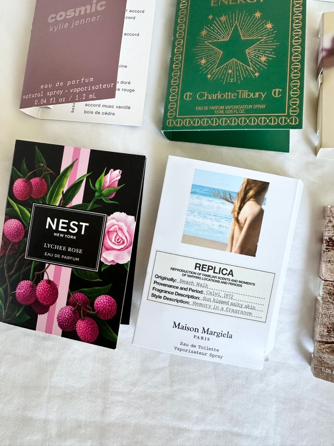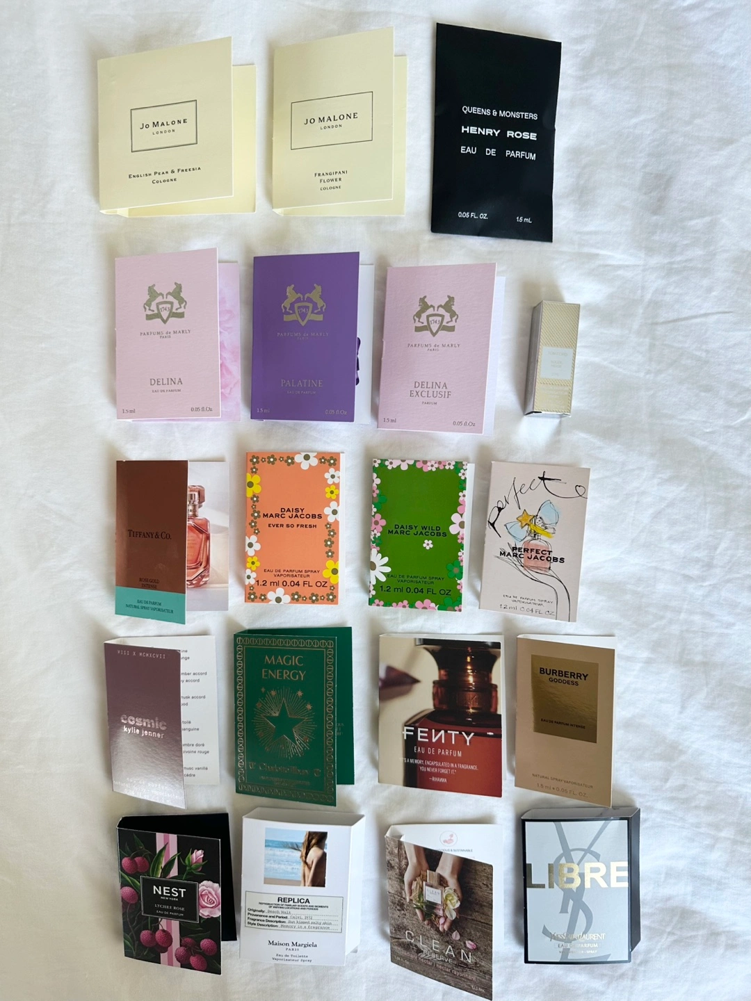Variety of perfume samples, unused, 19 pieces. Perfect for trying out new scents before committing to a full bottle. Includes samples from brands like: - Tom Ford - Nest - Maison Margiela - Tiffany & Co. - Jo Malone - Marc Jacobs - Charlotte Tilbury - Burberry - Fenty - Parfums de Marly - Kylie Jenner - Clean - YSL - Queens & Monsters