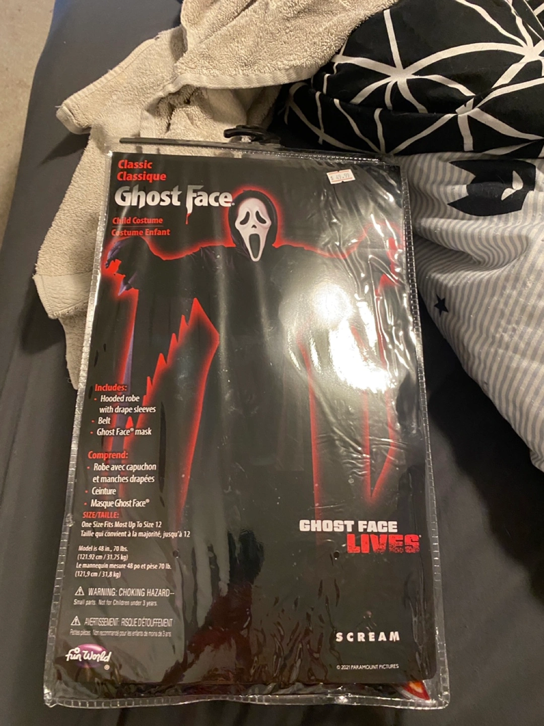 Selling a classic Ghost Face child costume! It's one size fits most up to size 12. Includes: - Hooded robe with drape sleeves - Belt - Ghost Face mask The model is 48 in., 70 lbs (121.92 cm/31.75 kg).