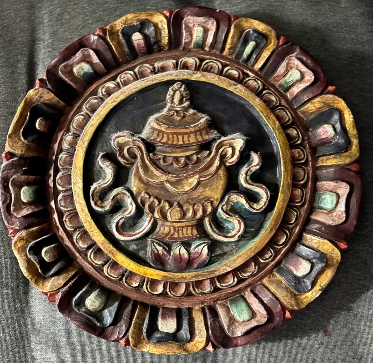 This is a beautiful wooden carved mandala wall art piece! It features intricate details and a unique design, perfect for adding a touch of artistry to any room. The colours are rich and varied, and the carving is very detailed About 11 inches in diameter