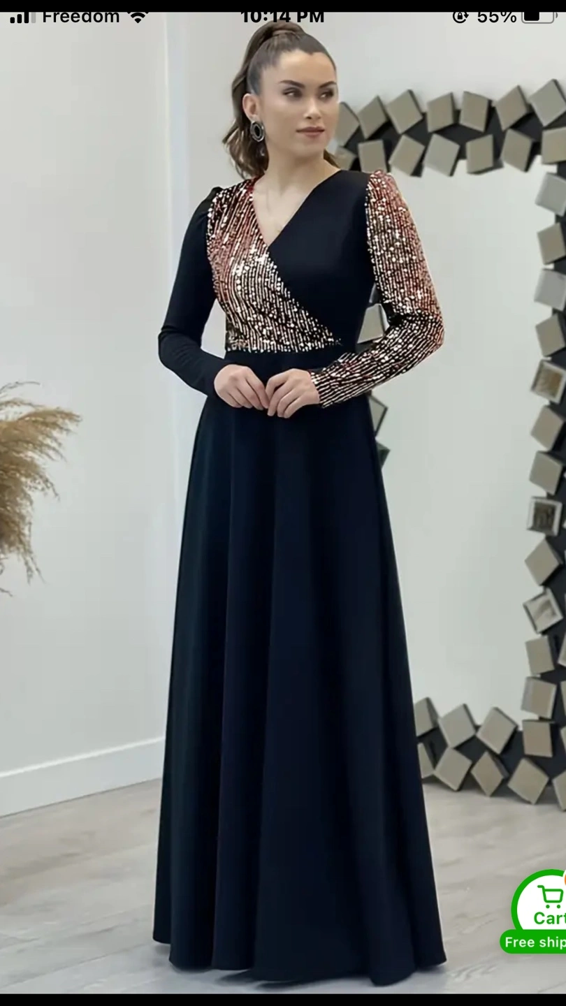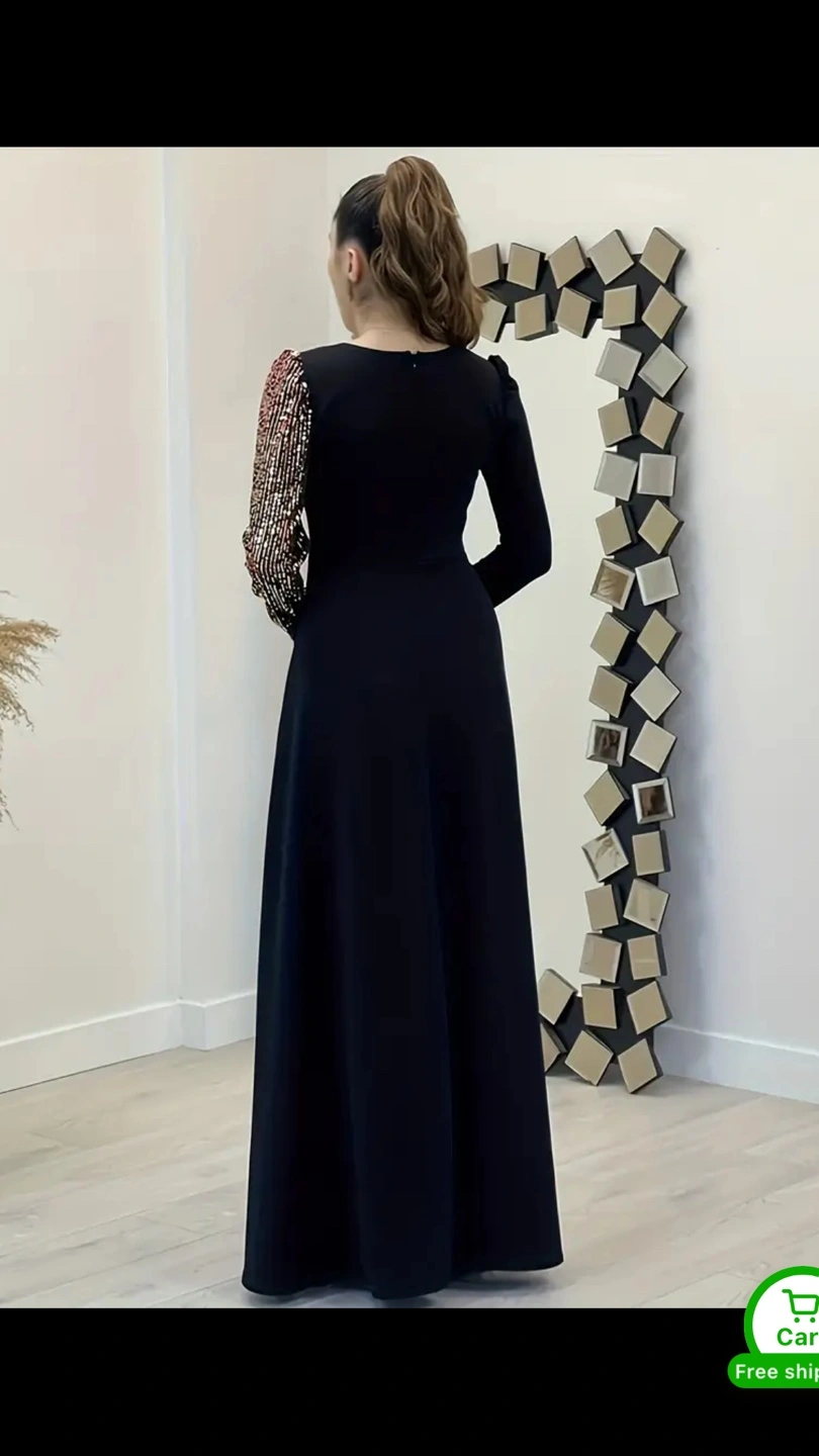 Elegant V-Neck Maxi Dress with Sequin Detail - Long Sleeve, Flared Silhouette, Black Polyester Evening Gown for Women, Perfect for Parties & Formal Events, Formal Evening Gown size medium