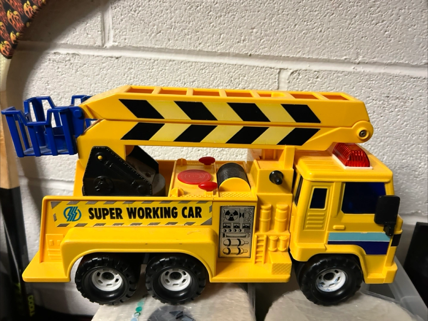 Selling a Super Working Car toy! It's a bright yellow colour with black and blue accents. Perfect for kids who love construction vehicles and imaginative play