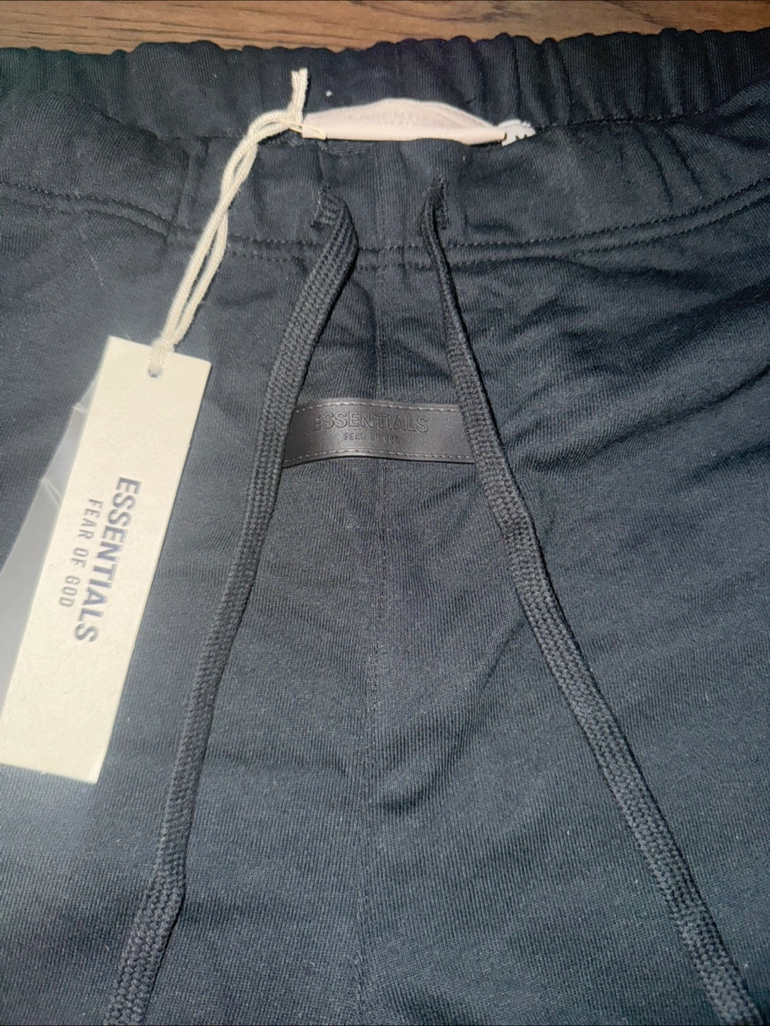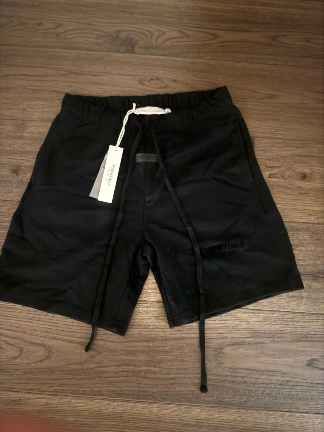 Brand new Essentials Fear of God shorts, size medium in black. These shorts are super comfortable and stylish, perfect for everyday wear. They feature a drawstring waist and the Essentials logo.