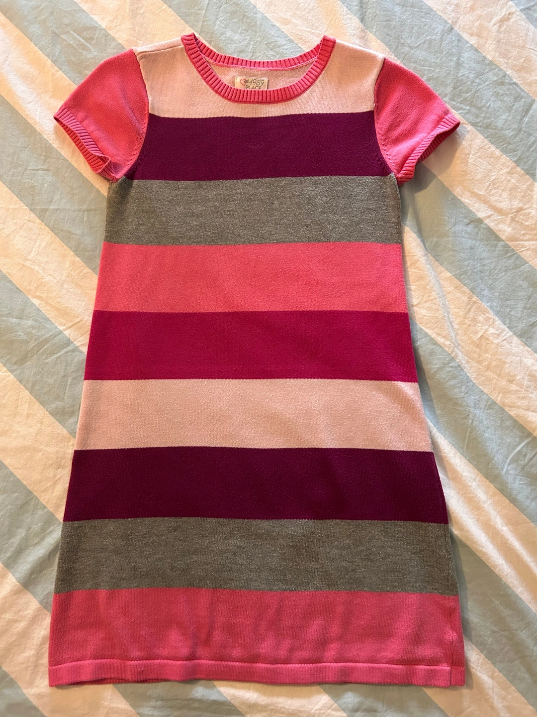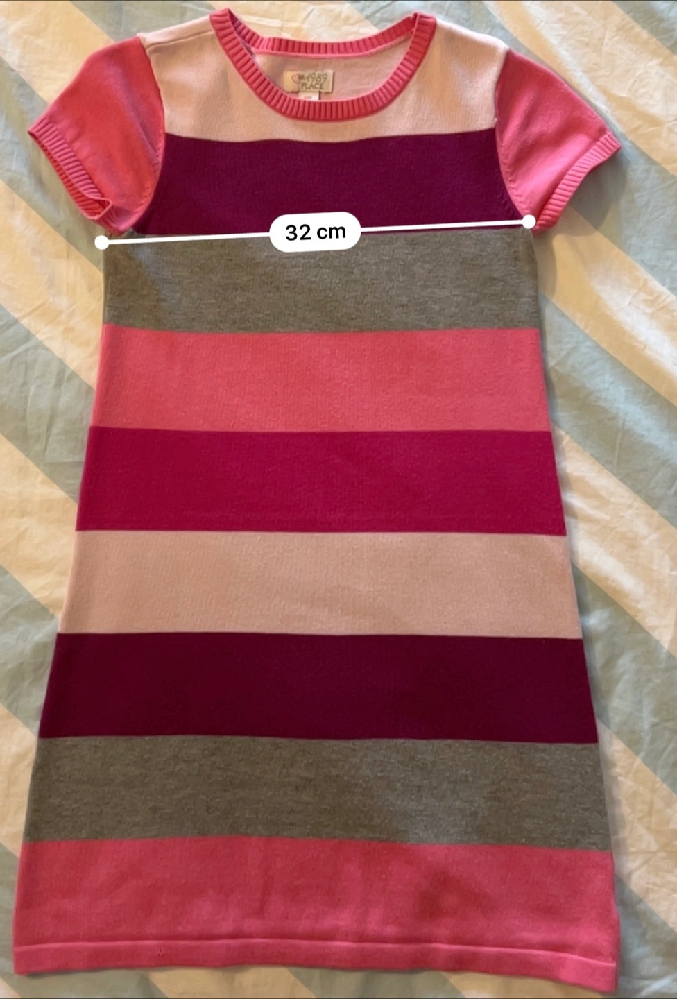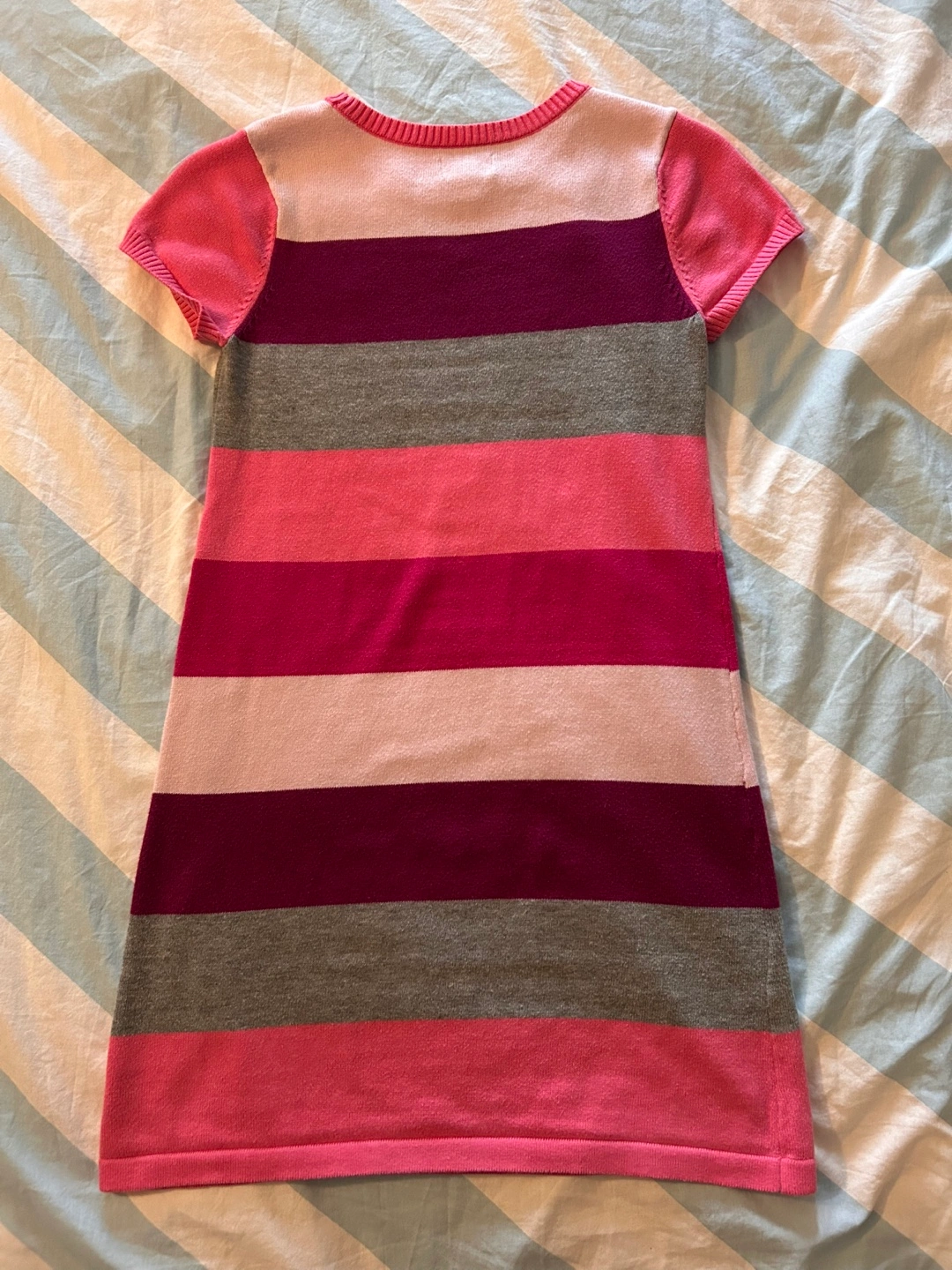 Size: L (10/12) Brand: The Children's Place Style: Short-sleeved knit dress with a round neckline. Gently used condition. Note on Wear: There is a very small pull/snag in the knit fabric near the bottom pink stripe. This is minor and does not significantly affect the overall look or wearability. No stains. - CASH ONLY - SMOKE FREE HOME First come, first served