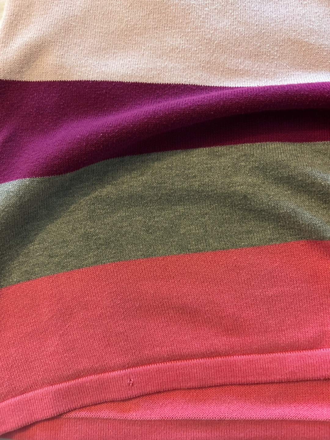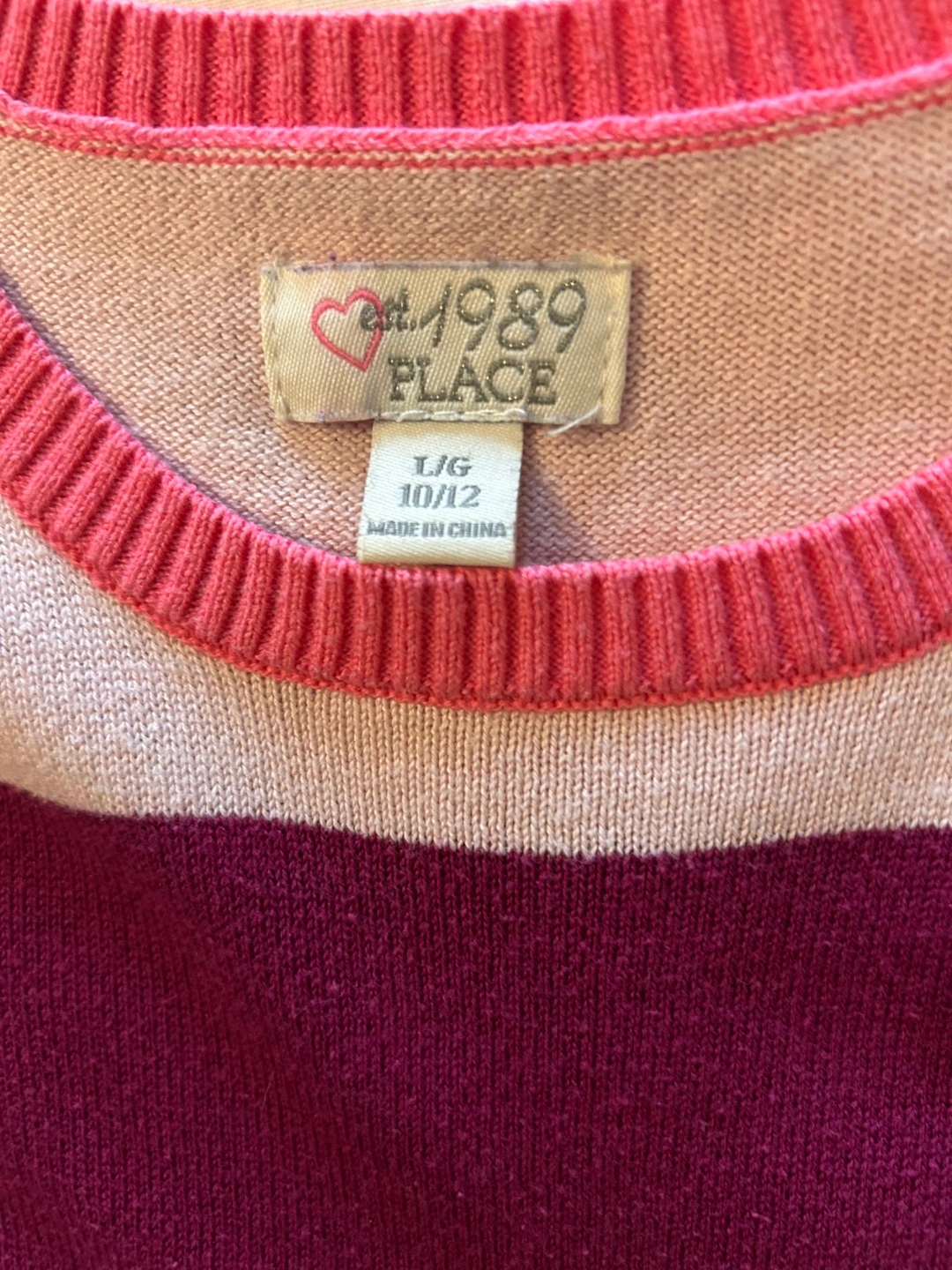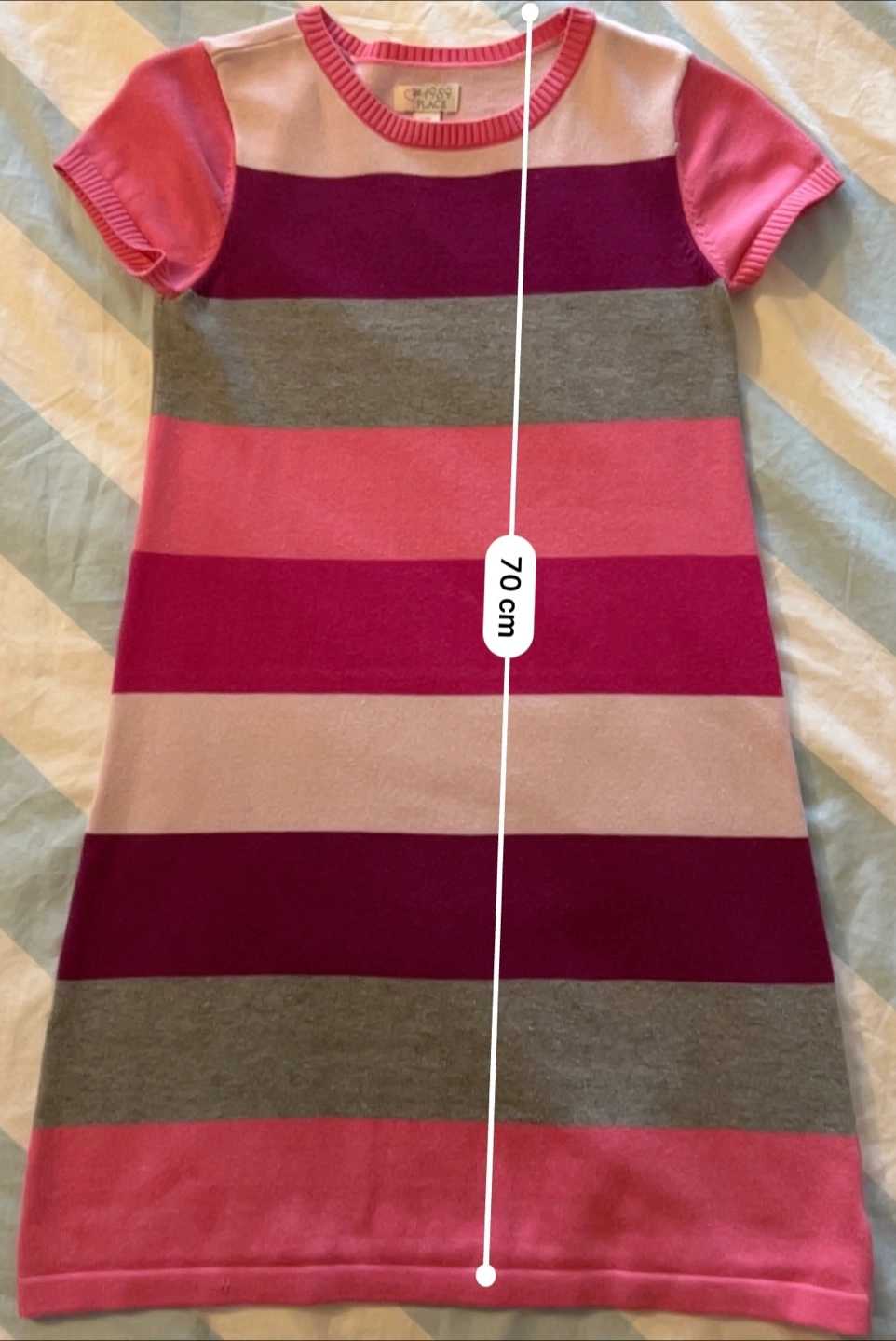 Size: L (10/12) Brand: The Children's Place Style: Short-sleeved knit dress with a round neckline. Gently used condition. Note on Wear: There is a very small pull/snag in the knit fabric near the bottom pink stripe. This is minor and does not significantly affect the overall look or wearability. No stains. - CASH ONLY - SMOKE FREE HOME First come, first served