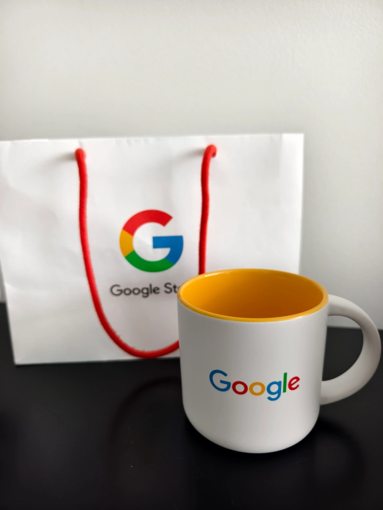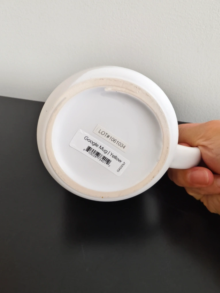 Selling a Google mug! It's white on the outside with a cheerful yellow interior. Perfect for your morning coffee or tea at your desk. The mug comes with the original Google Store bag.