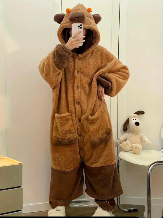 Snuggle up in this adorable bear-themed hooded loungewear! It's super soft and cozy, perfect for relaxing at home. Features a cute bear hood and a comfy, oversized fit. The material is a plush, teddy-bear-like fabric in a warm brown colour.