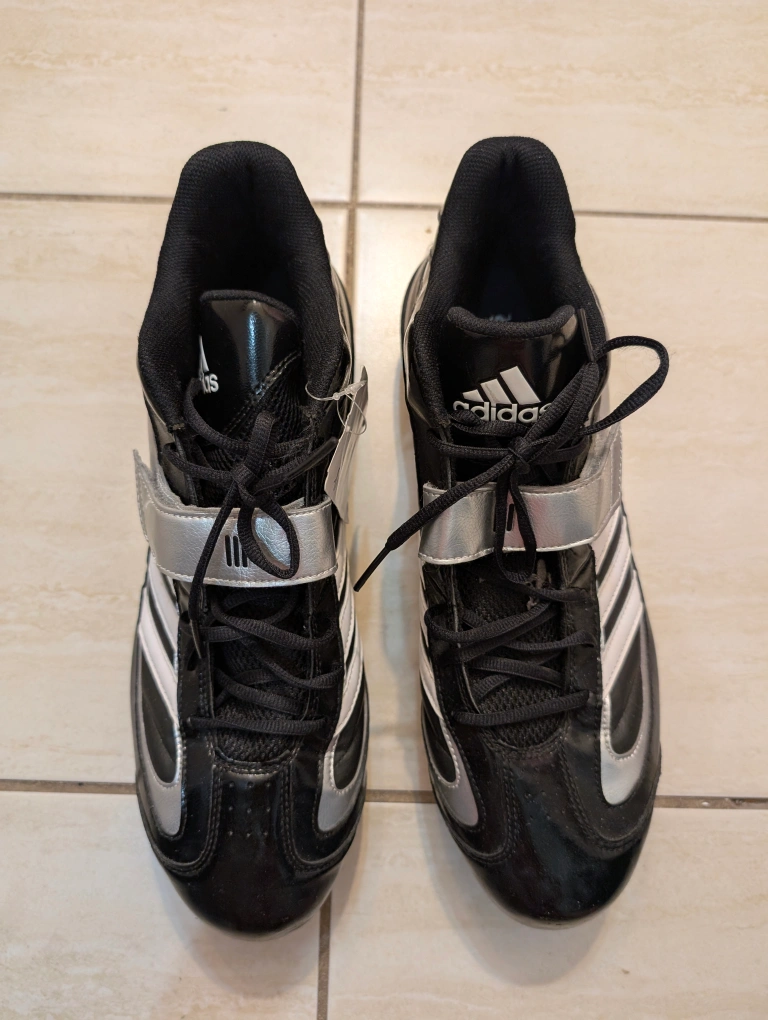 Selling a pair of brand new Adidas University Mid Football Cleats shoes in black and silver. They have the classic Adidas stripes and a strap for a secure fit. Great for athletic activities!