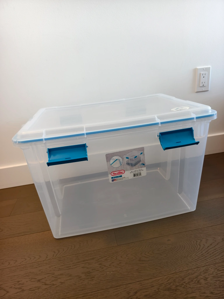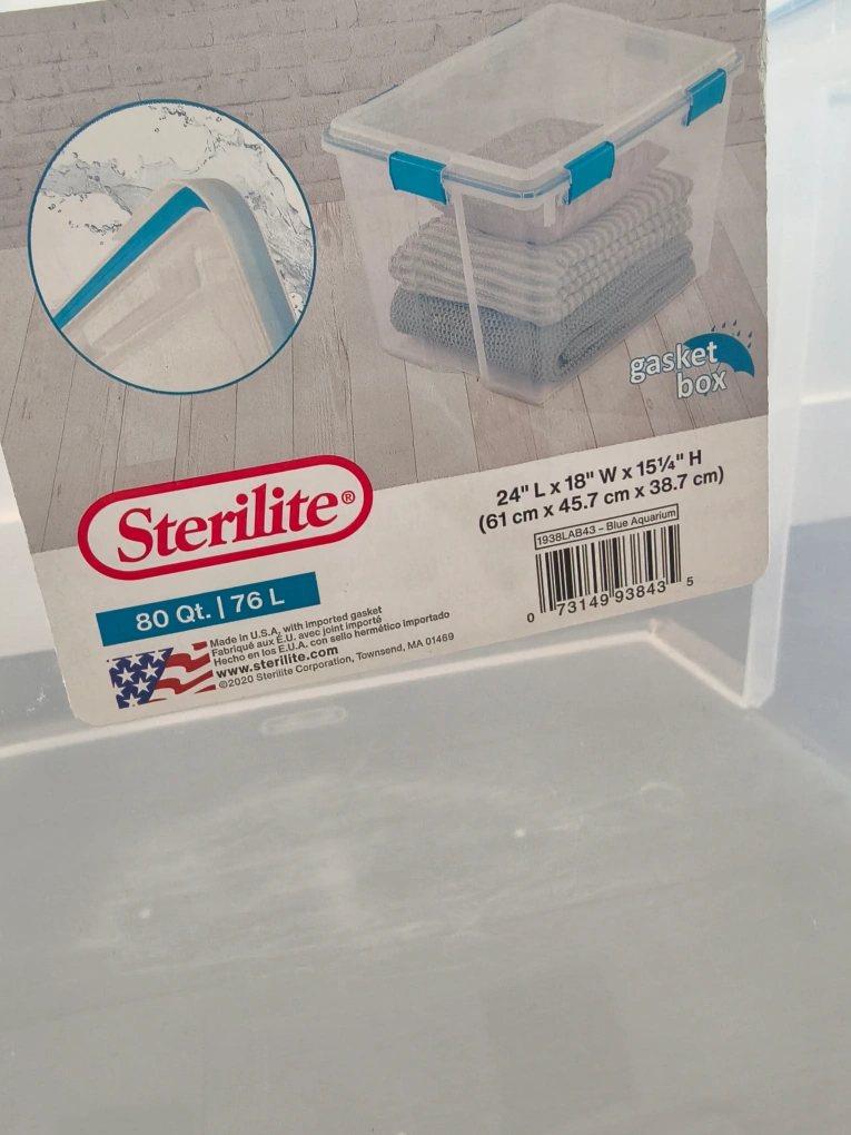 Selling a Sterilite Gasket Box, perfect for storage! It's in great condition and ready to help you organize your space. The box is 80 Qt / 76 L in size, with dimensions of 24" L x 18" W x 15 1/4" H (61 cm x 45.7 cm x 38.7 cm).
