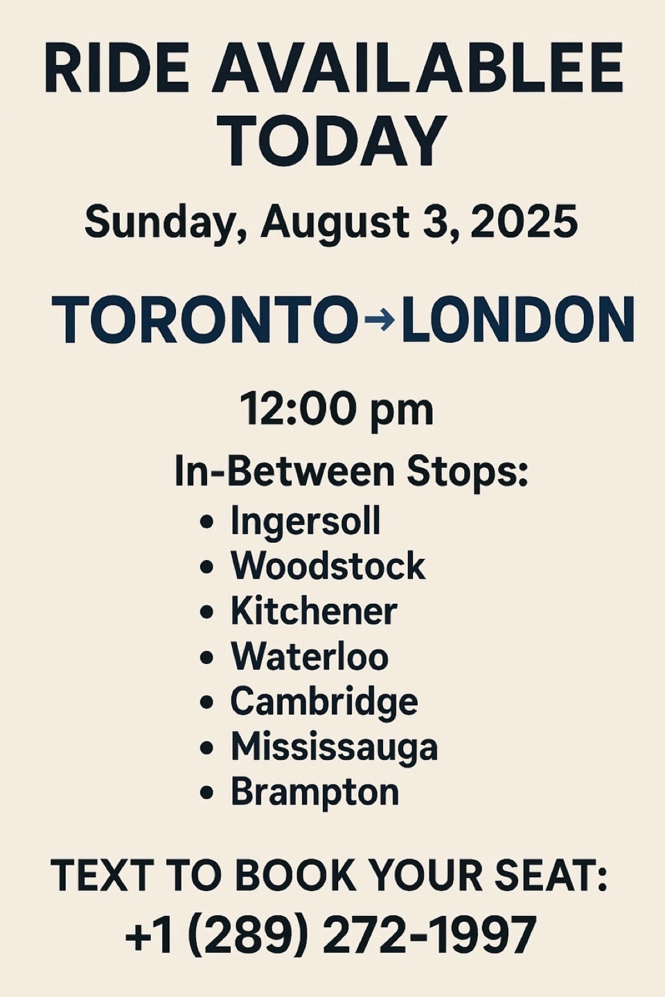 Need a ride from Toronto to London today? Iโm offering a comfortable and reliable trip at 12:00 PM with multiple convenient stops along the way: โข Ingersoll โข Woodstock โข Kitchener โข Waterloo โข Cambridge โข Mississauga โข Brampton ๐ Date: Sunday, August 3, 2025 ๐ Departure: 12:00 PM ๐ Route: Toronto โก๏ธ London (with in-between stops) ๐บ Limited seats available โ reserve now! ๐ฒ Text to Book Your Seat: +1 (289) 272-1997