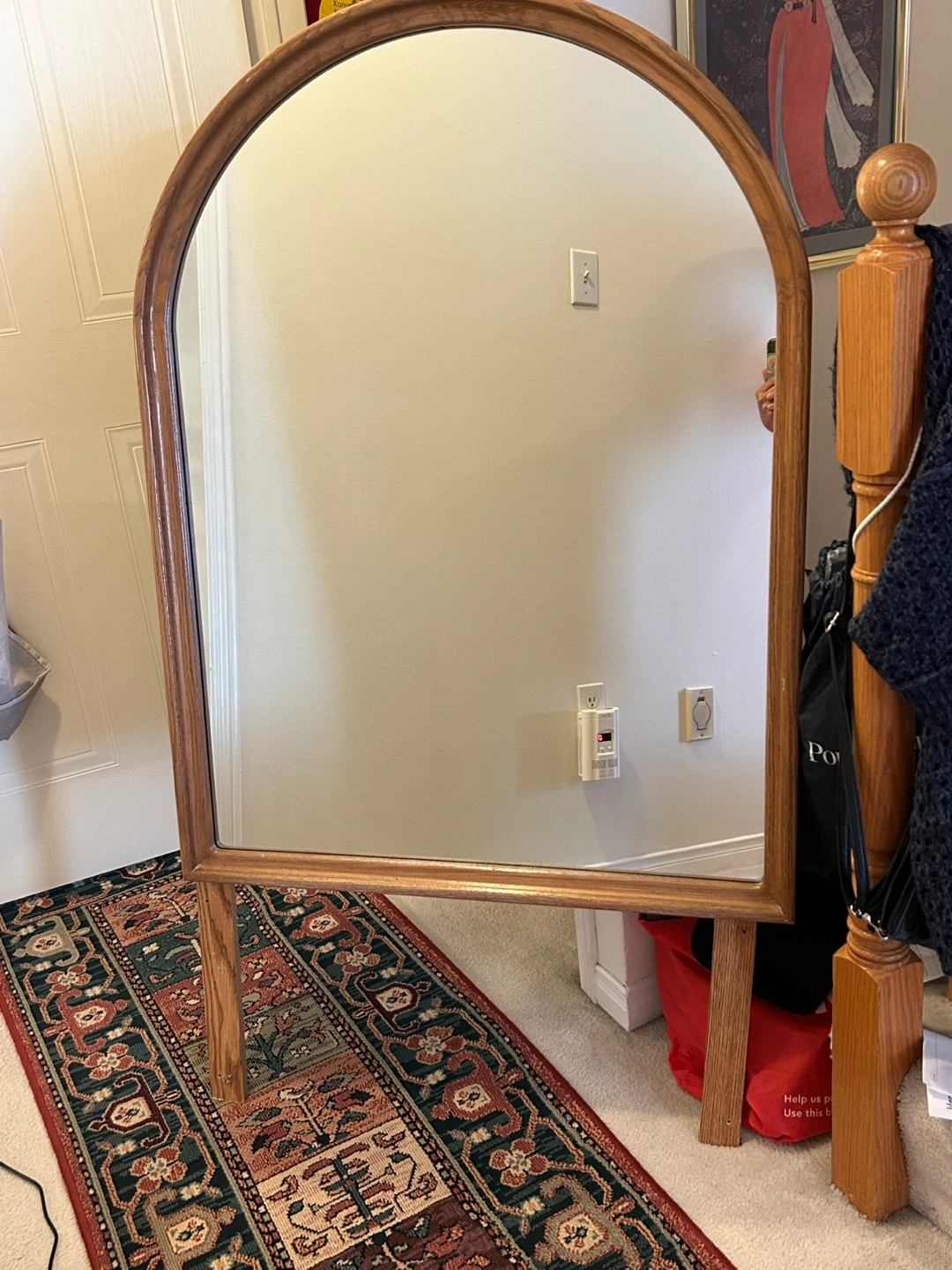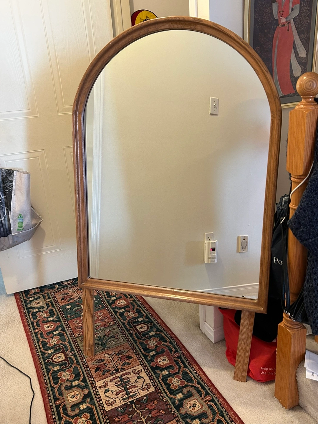 Selling a large arched mirror with a wooden frame and leg stands for the vanity. It's in great shape and would look wonderful in any bedroom.