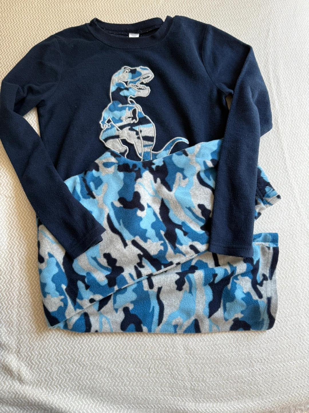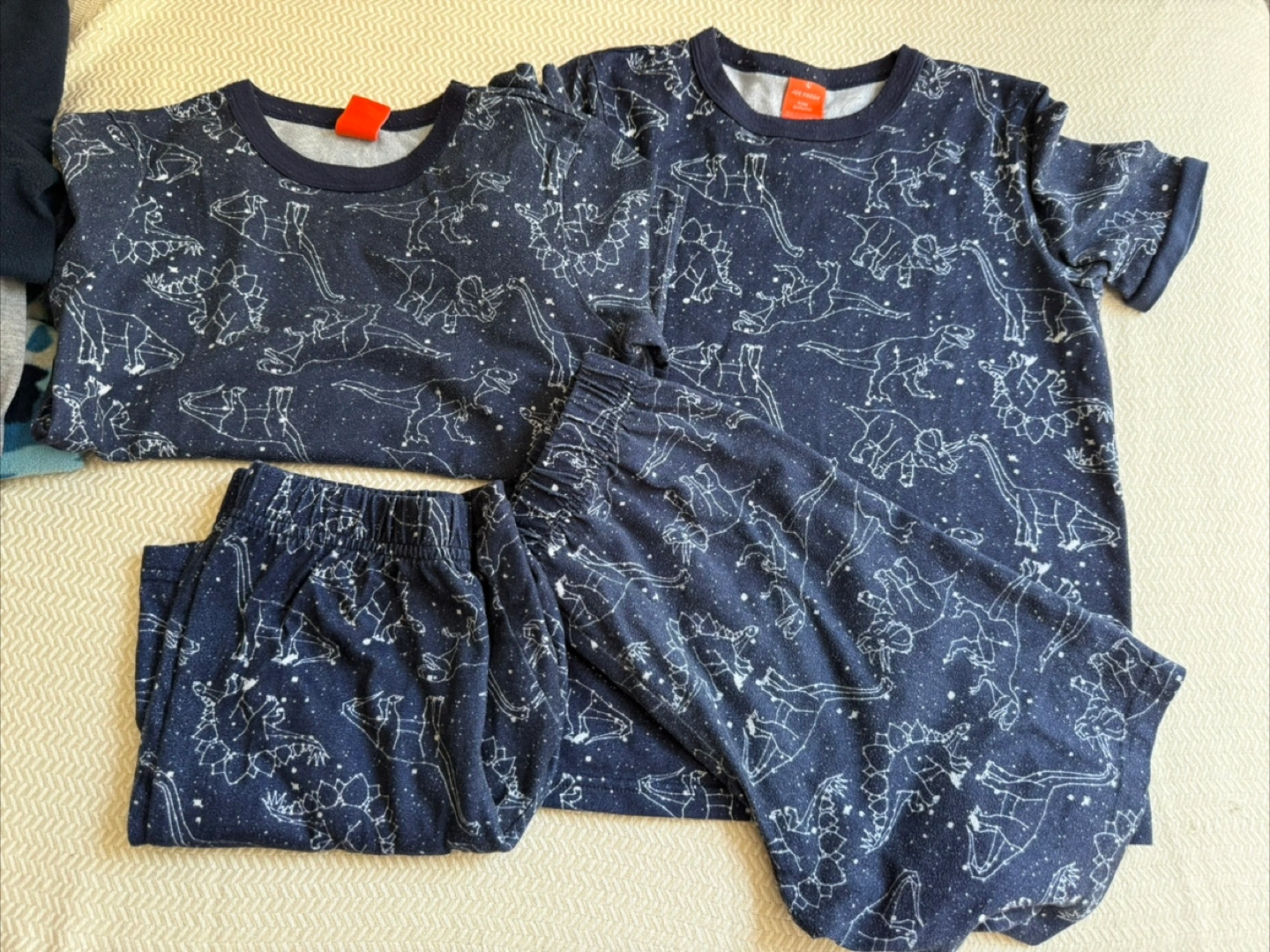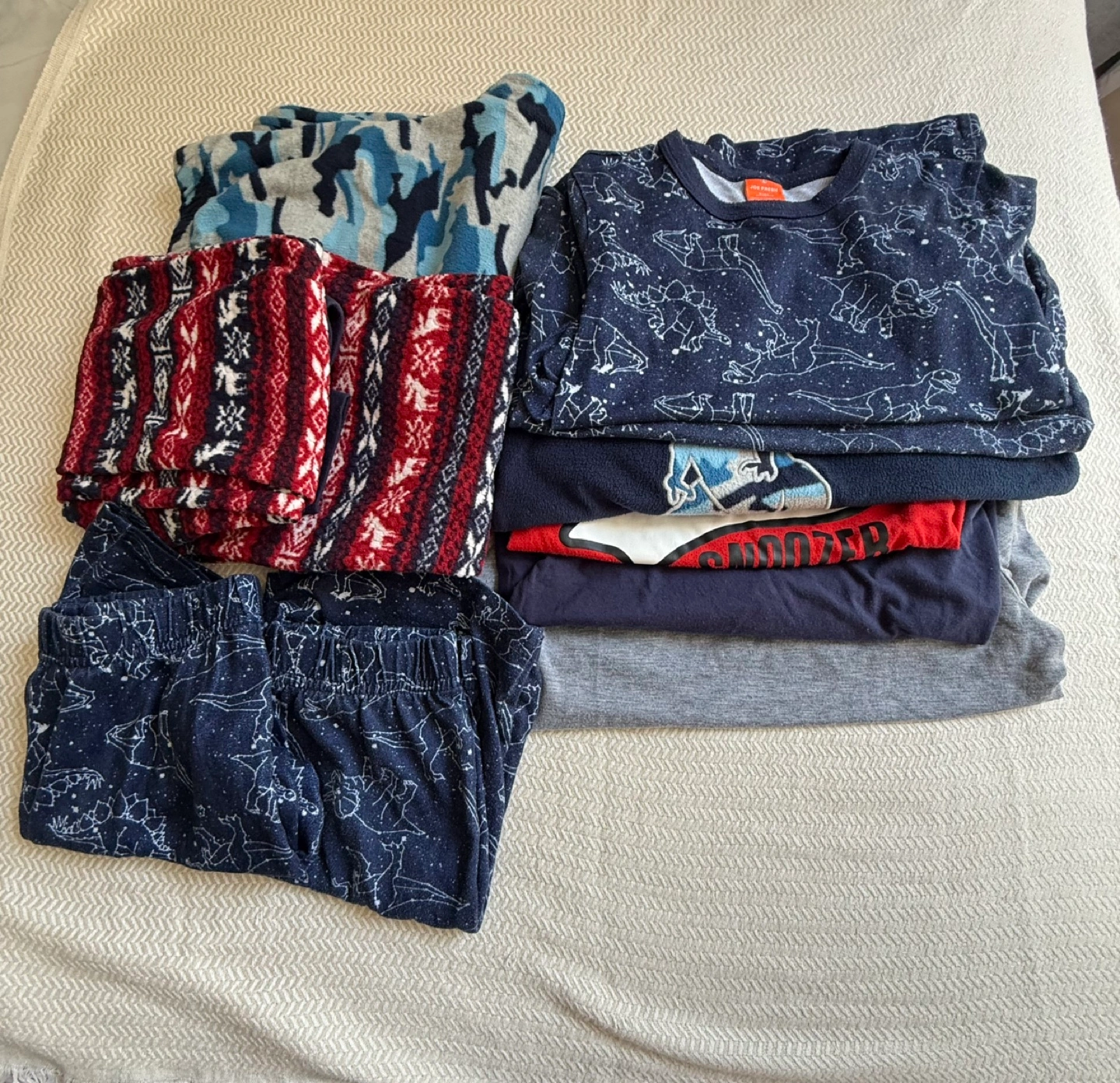 Selling a bundle of kids' pajama sets. There are various sizes and designs, including dinosaur and baseball themes. Good to fair condition