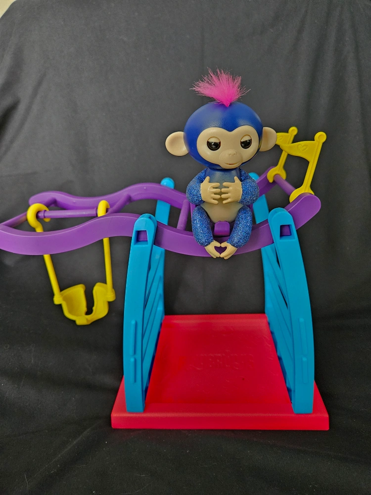 Here's a Fingerlings playset! It includes a blue glitter monkey with pink hair and a playset with a swing. The playset is colourful with purple, yellow, and blue accents. A fun toy for kids!