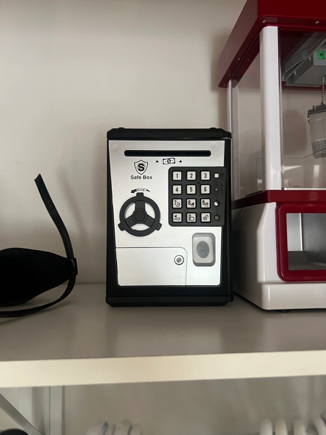 I'm selling a Safe Box electronic piggy bank. It's in great condition and ready to help someone save their coins and bills. It features a keypad, coin slot, and fingerprint scanner for added security. Perfect for kids or anyone who wants a fun way to save! Price negotiable I’ll send you the code