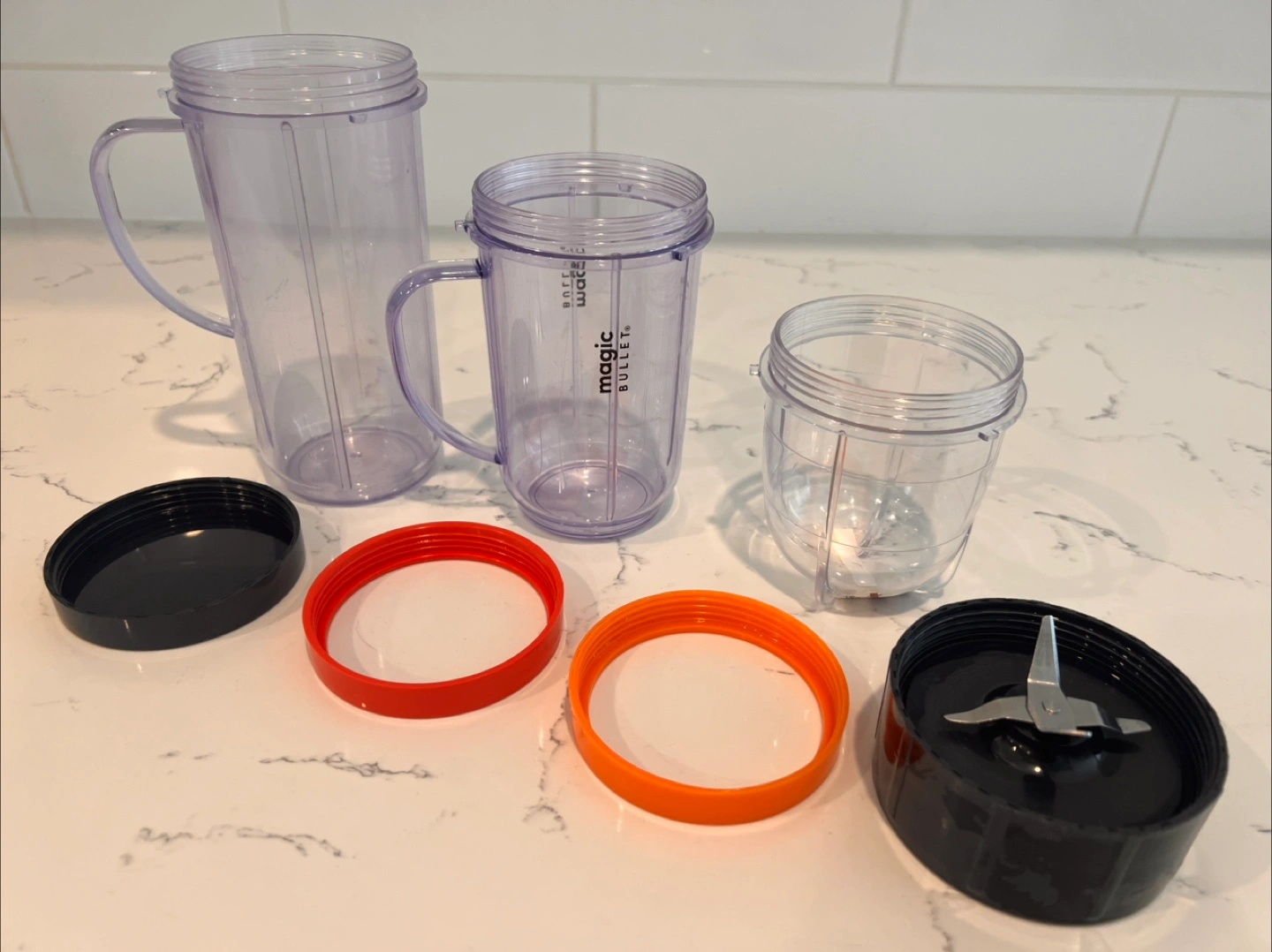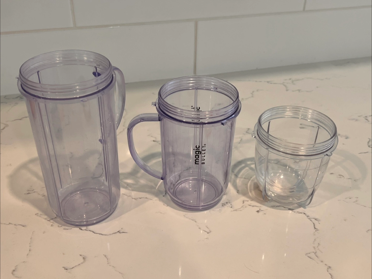 - Cup and parts replacement for Magic Bullet - 3 different size cups with handles - Some parts were never used - The blades are still very sharp - Like New - Model: MB1001B Meet-up and Pick-up are available Cash only, please