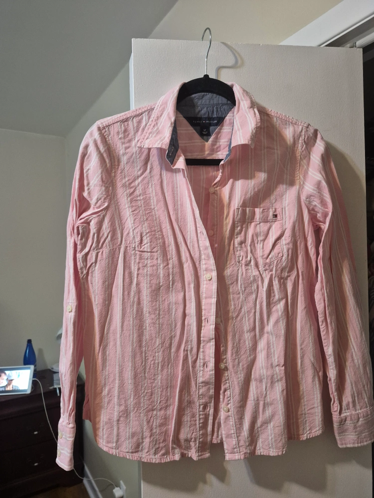 Tommy Hilfiger button-up shirt in a light pink and white striped pattern. It's a size small and made in India. Great for a casual look!