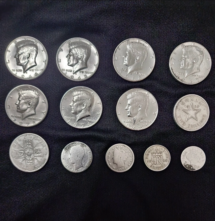 Selling a mixed lot of collectible coins, including Kennedy half dollars from the 1960s and 1970s, as well as coins from Ghana, the UK, and other countries. A great starter set for a coin collector!