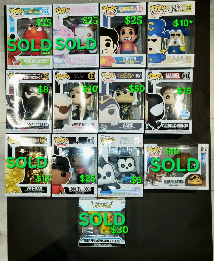Hi there! - yes, the items pictured are 100% available, no need to ask, only to message to pick up or ask questions based on the photos provided - located at M8V 1G5 & I will provide the full address if you are interested in picking up. Not offering shipping. Kindly asking for cash upon purchase. I am offering bundle deals and discounts if you're looking to purchase other items from my listings. Please see below - please be kind and respectful :) These prices as my lowest asking, thank you for understanding. All brand new in box, never been opened, and not being displayed. Excellent to near mint/mint condition as pictured. Cap'n Crunch is not mint but only as bad as shelf wear. Ashe box is not as tight as it could be from the back top right as pictured in final photo. This is a 9 year old pop, and is perfect/mint everywhere else. Check out my listings for more collectibles, comics, cards, sports memorabilia, Funko Pops and Soda, and much more. No trades. Thank you for taking the time to read the description