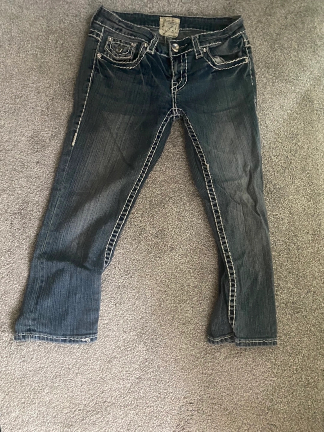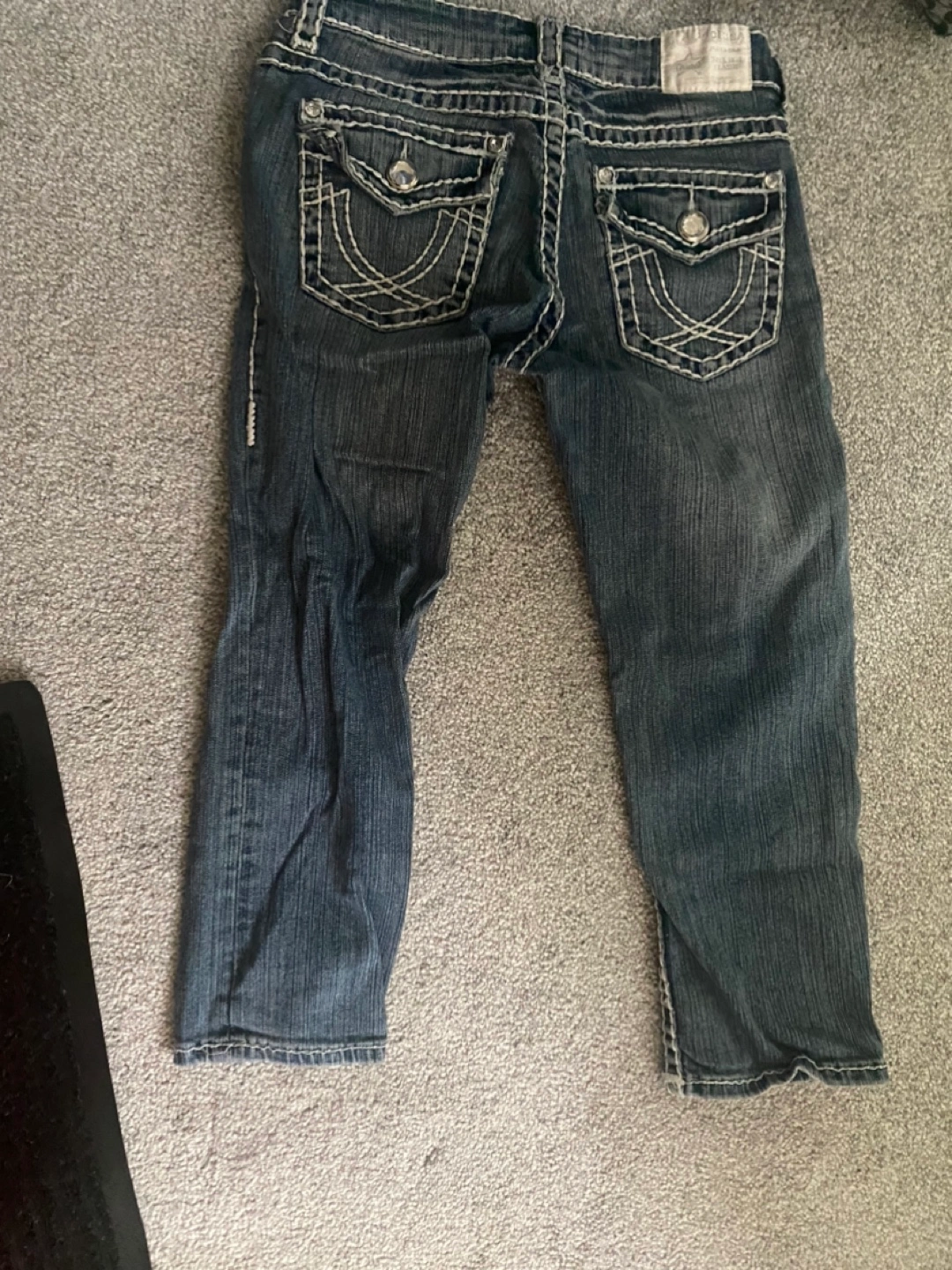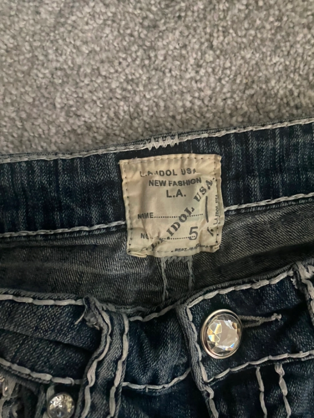 IDOL USA jeans in size 5. They feature a stylish design with detailed stitching. Perfect for casual wear! I just need to throw em in the wash, wrinkly from storage.