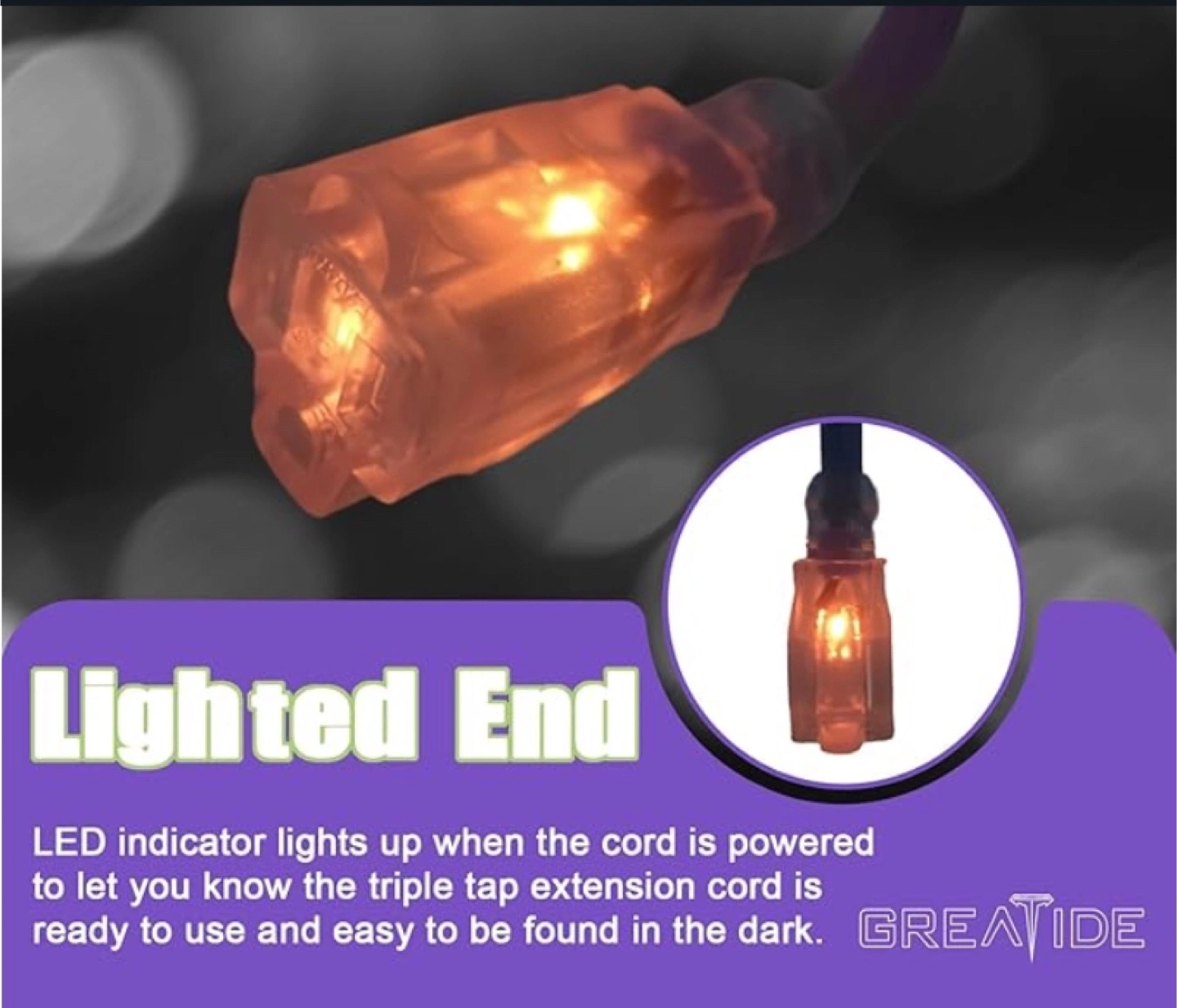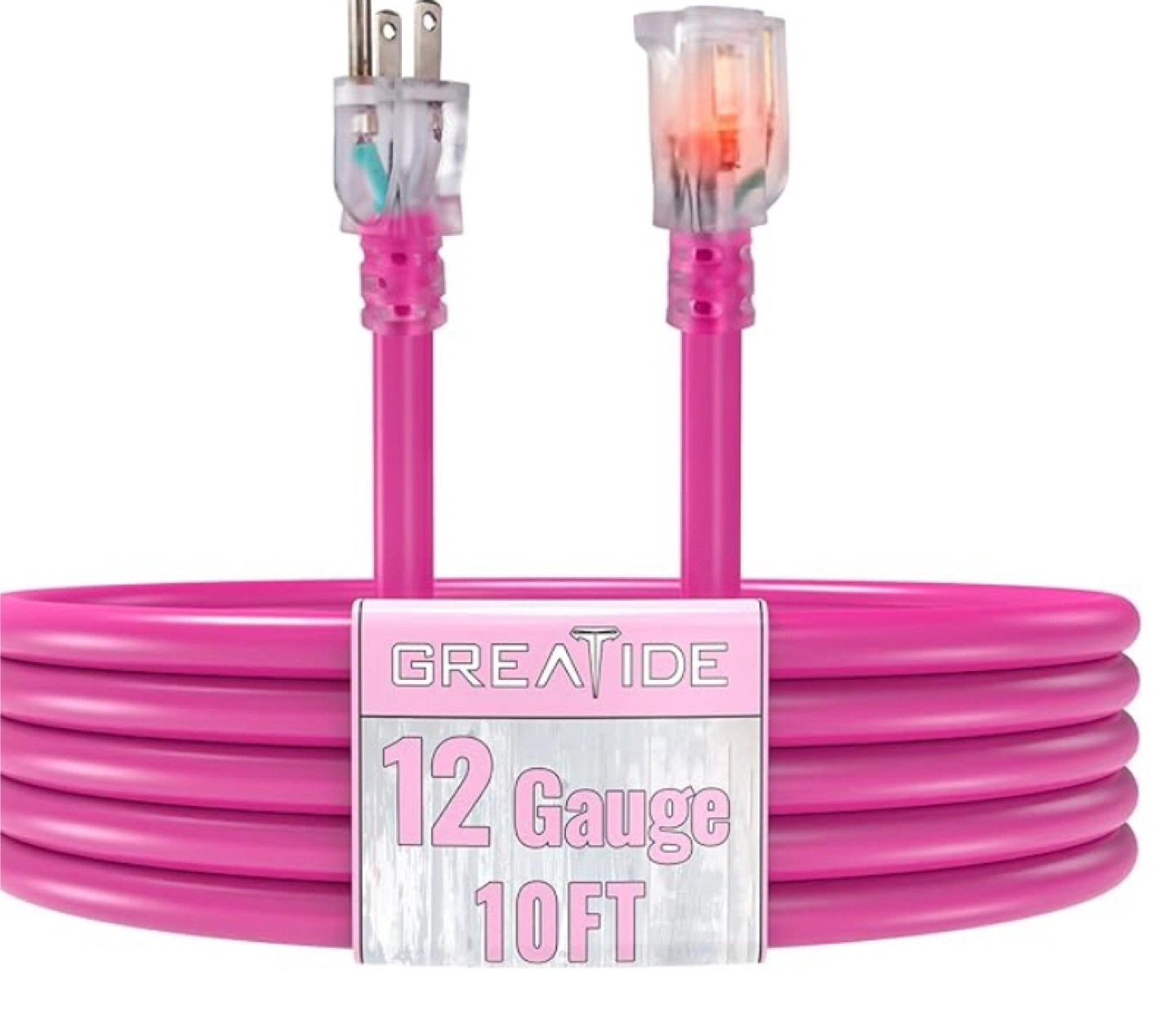 Selling a Greatide 10FT extension cord, perfect for both indoor and outdoor use! It's a vibrant pink colour and features a lighted end with an LED indicator, making it easy to find in the dark. - 12 Gauge - 3 Wire - 15 Amp - 1875 Watts - 125 Volts