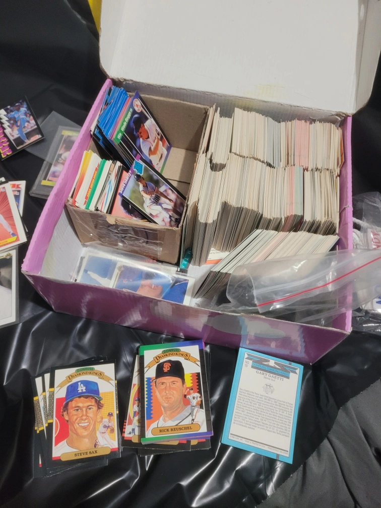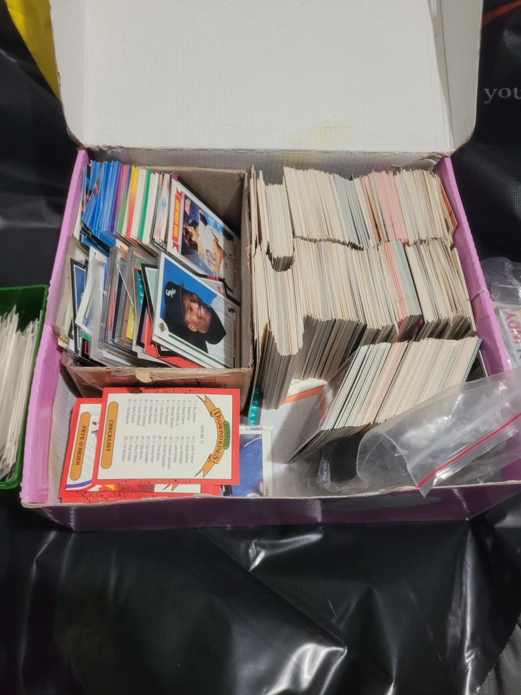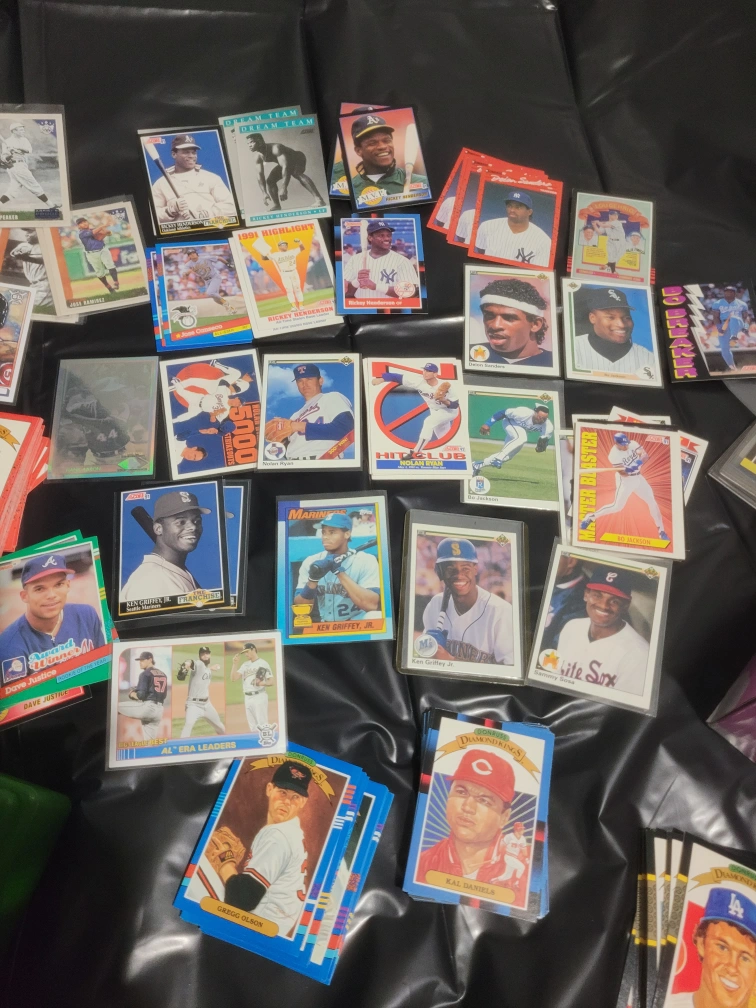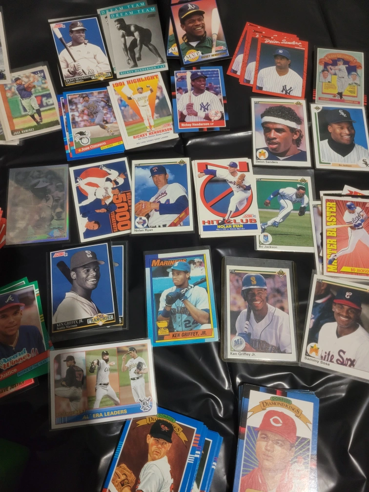 a few hundred baseball cards from 80's,90's,and 2020's.Ken Griffy Jr. rookie cards as well as many other greats like Bo Jackson,Sammy Sosa,Dieon Sanders,Nolan Ryan,and many more. Selling the box.Not individuals. It's all or none for $100.