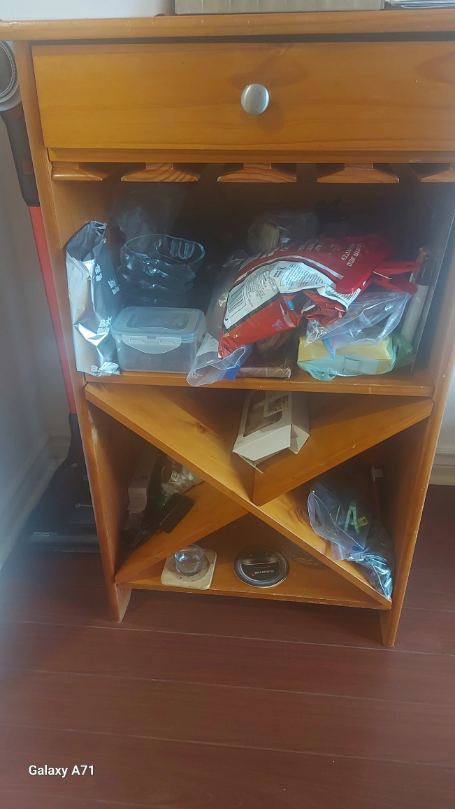 A wooden wine rack cabinet, perfect for storing wine bottles and glasses. It also features a drawer for extra storage. It's in good condition and ready for a new home! NO DELIVERY AND CASH DEAL AND EMPTY RACH.