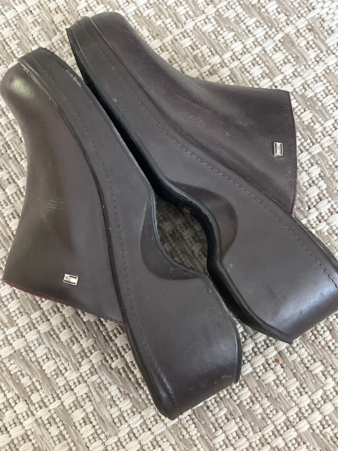 Cute Tommy Hilfiger clogs in a dark brown leather! They have a bit of a platform heel. They were wore once but have been in storage ,they're in good shape! Size 8.5