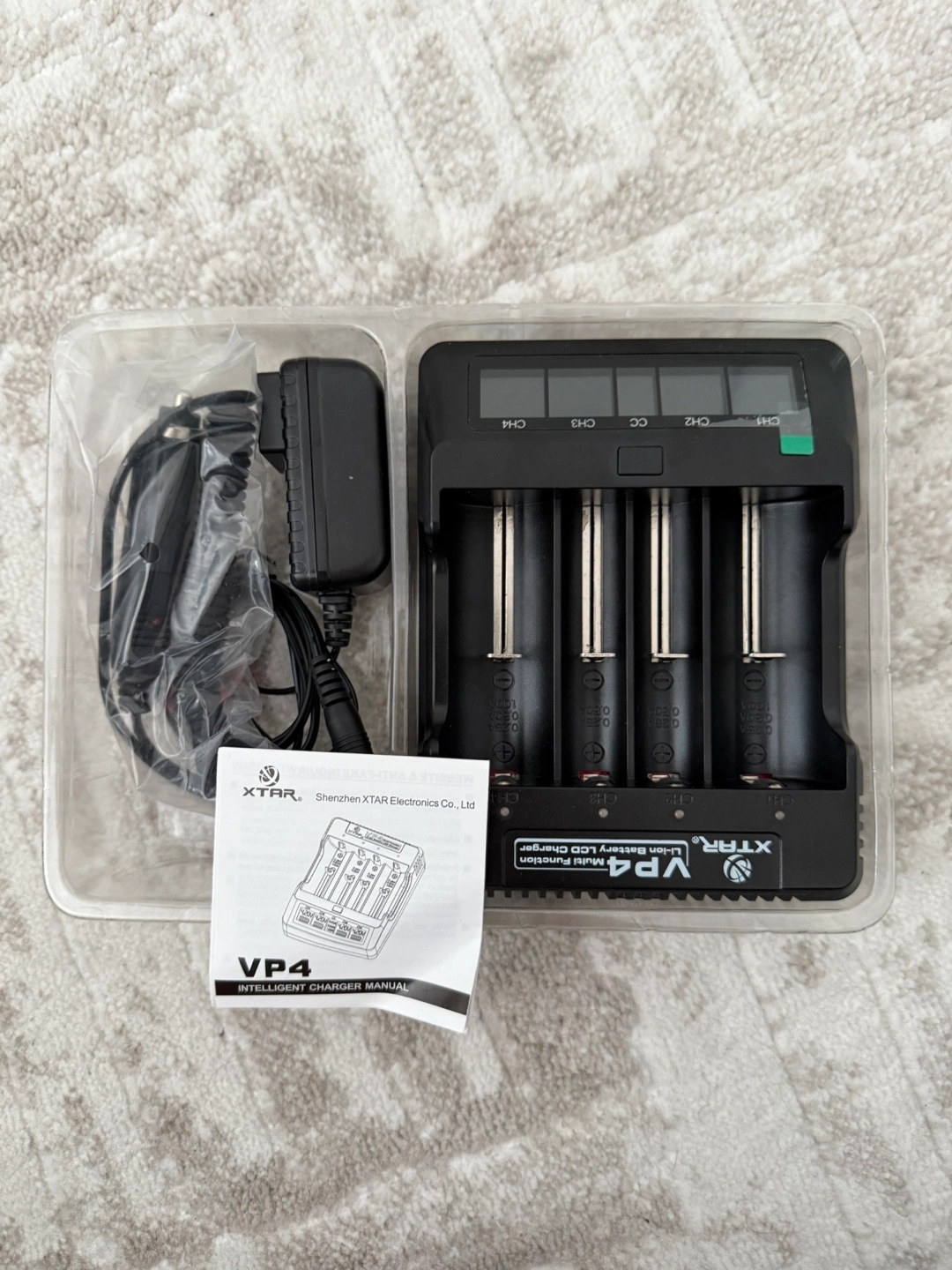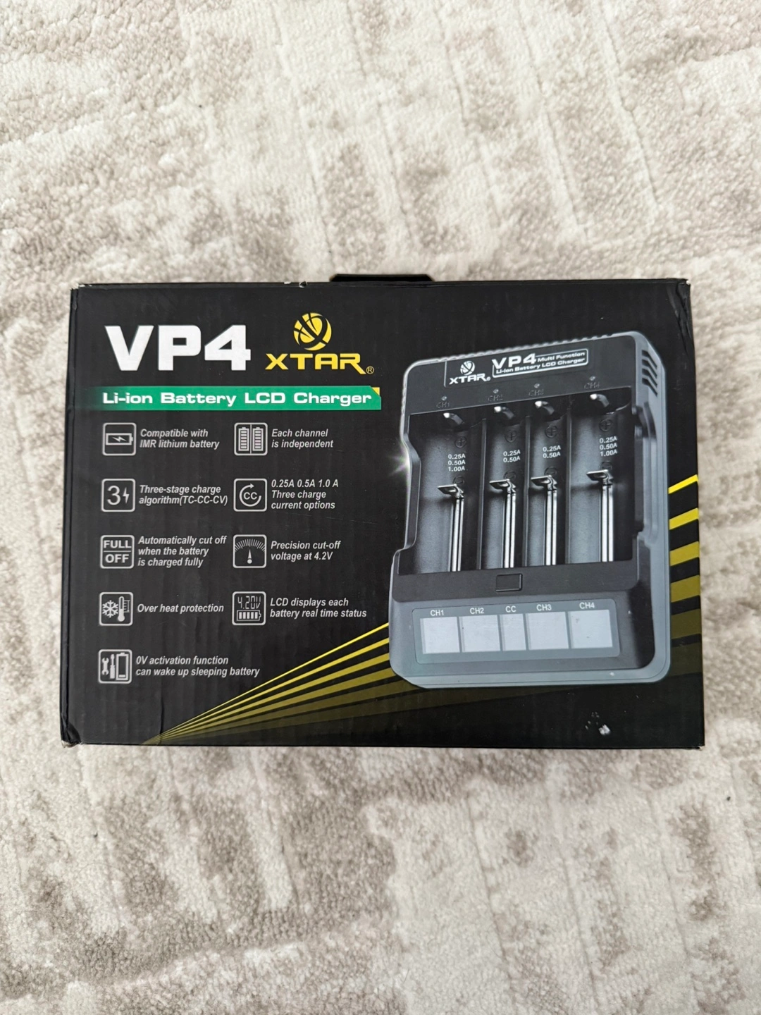 Selling an XTAR VP4 Li-ion Battery LCD Charger! It's compatible with IMR lithium batteries and features a three-stage charge algorithm (TC-CC-CV). Each channel is independent, and it offers three current options: 0.25A, 0.5A, and 1.0A. It also includes over-heat protection and an LCD that displays each battery's real-time status. Comes with the box and intelligent charger manual