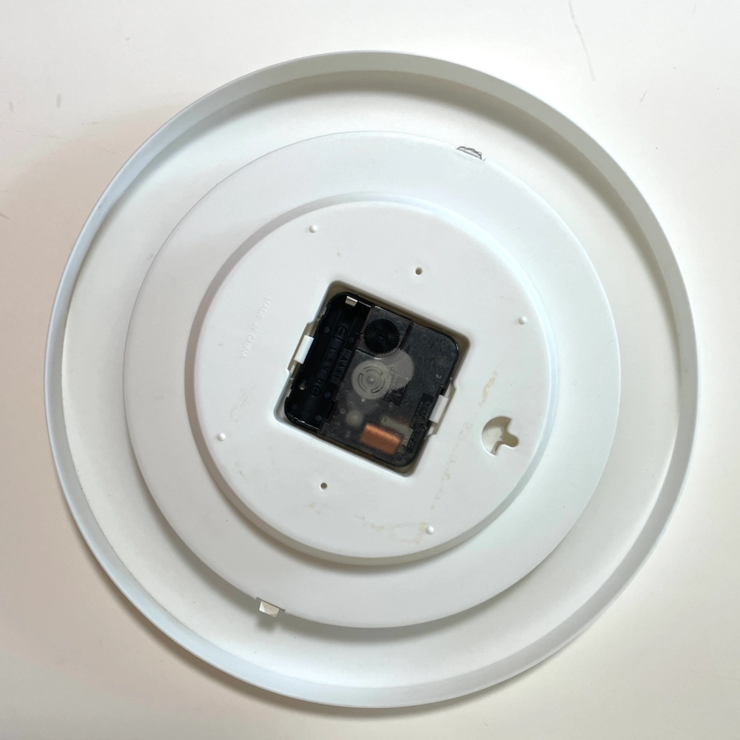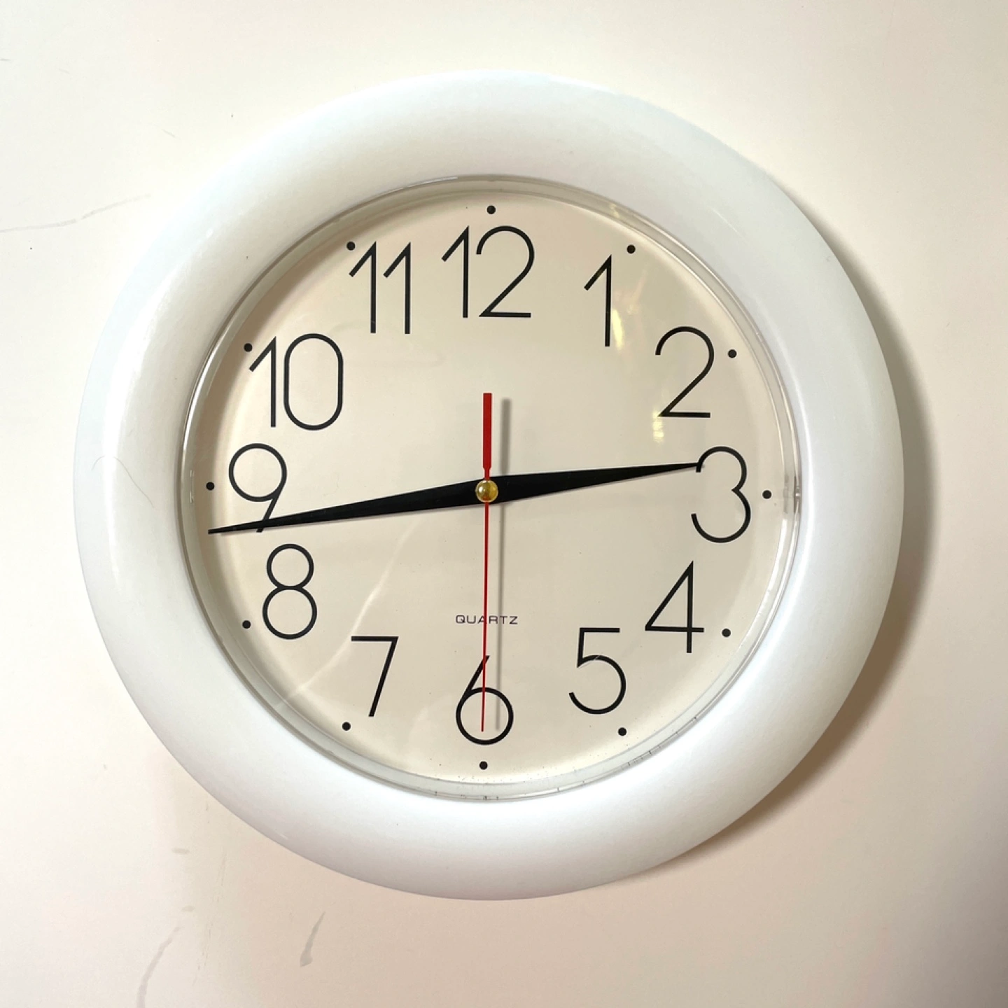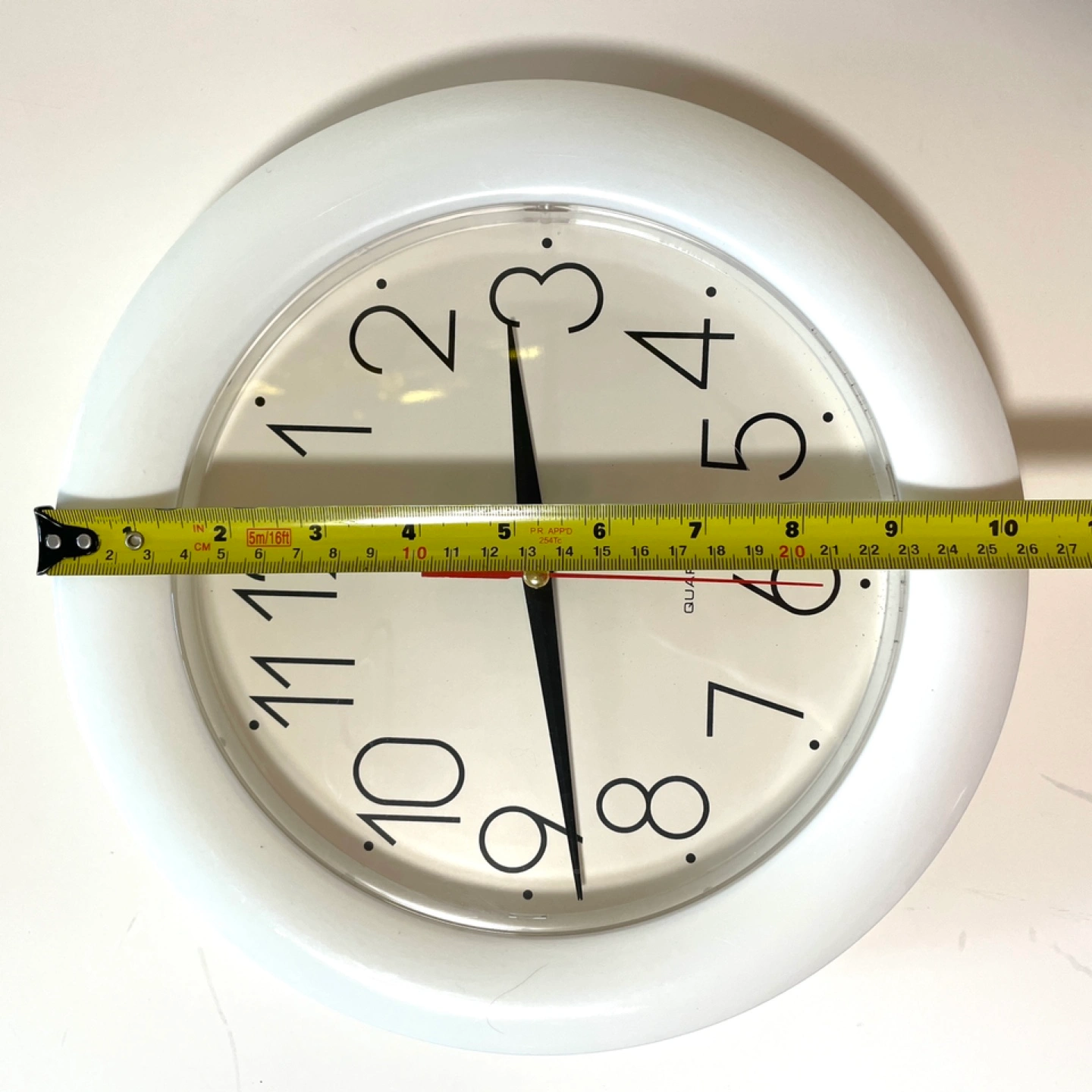 A simple and clean white wall clock! Measures about 10 inches in diameter, perfect for any room. In great condition with no chips or cracks.