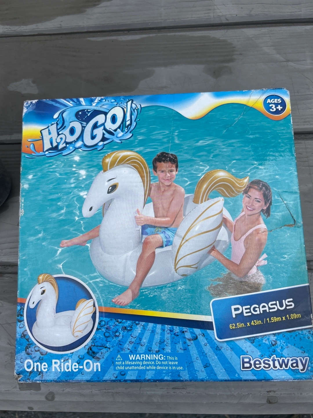 Get ready for some fun in the sun with this Bestway H2OGO! Pegasus ride-on float! It's perfect for kids ages 3 and up. - Pegasus design - Dimensions: 62.5in x 43in / 1.59m x 1.09m - One ride-on float Located in Elmwood