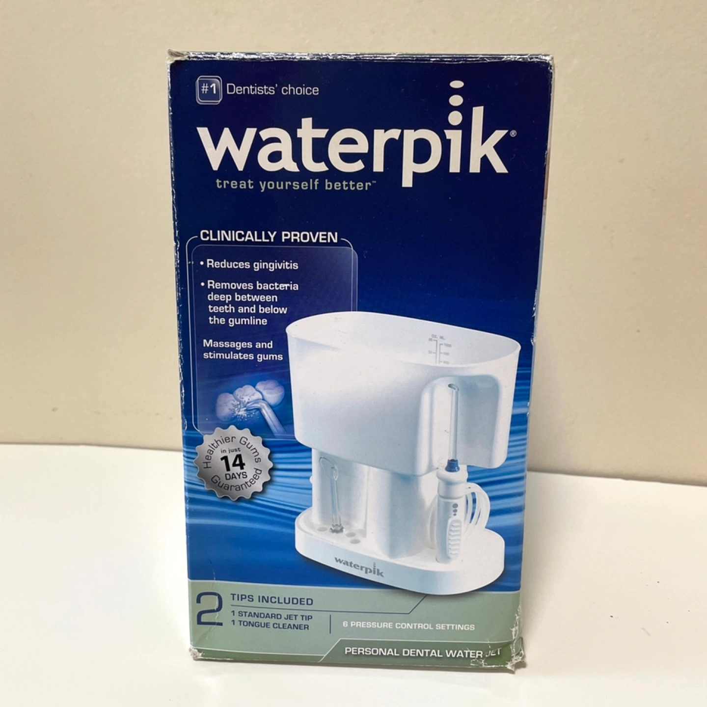 Waterpik personal dental water jet New never used Reduce gingivitis and removes bacteria deep between teeth and below the gumline. Also massages and stimulates gums. With a high-volume water reservoir for longer use between refills six-setting pressure control Includes 2 standard jet tips