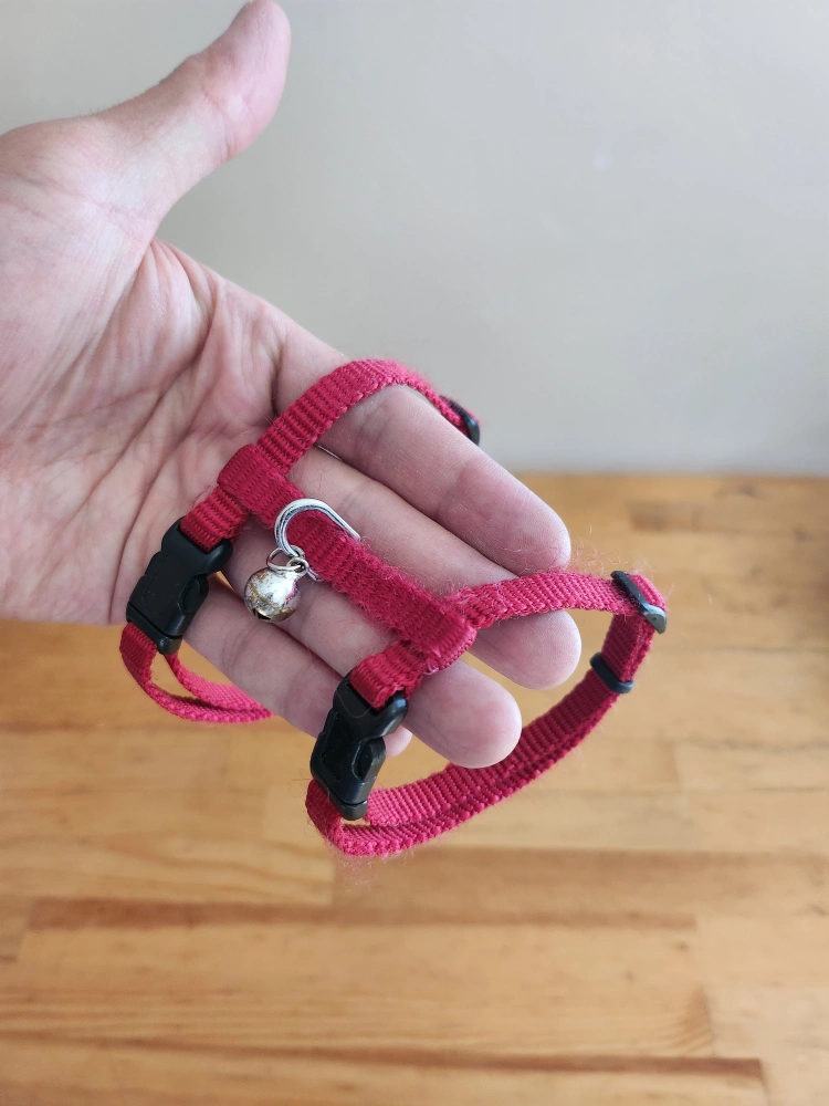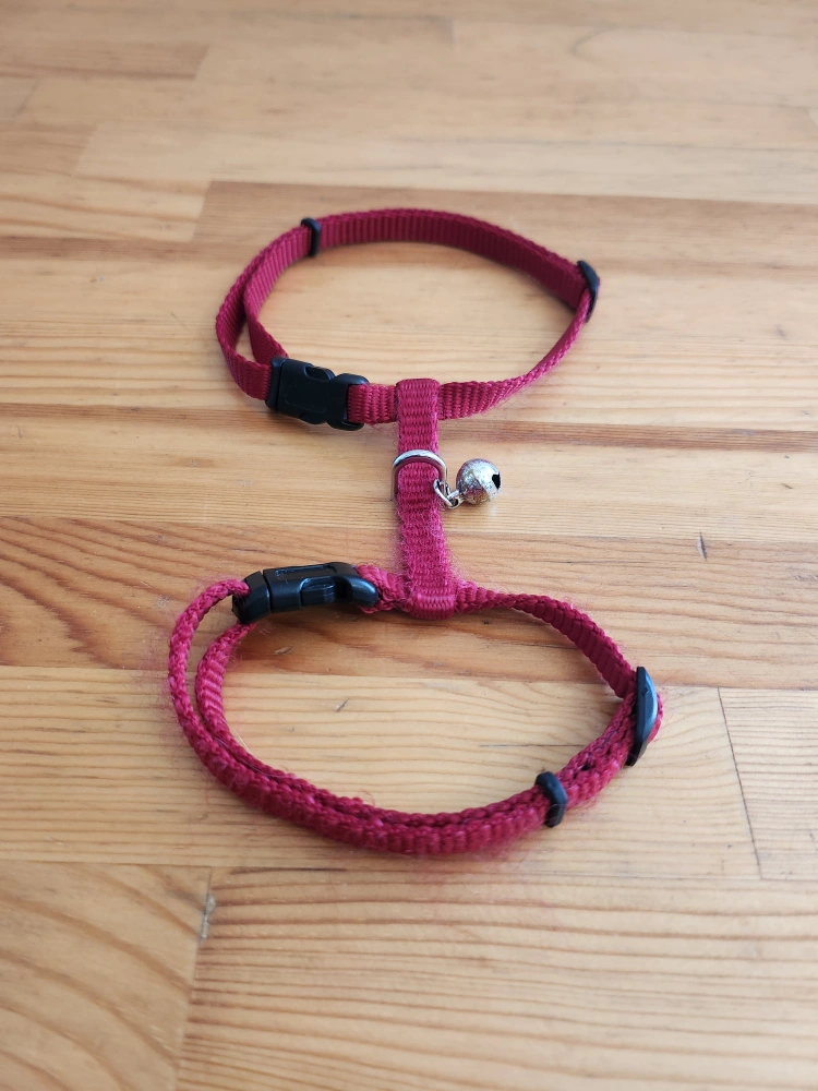 Red kitten harness, perfect for taking your kitty on outdoor adventures! It comes with a little bell to help you keep track of your feline friend!