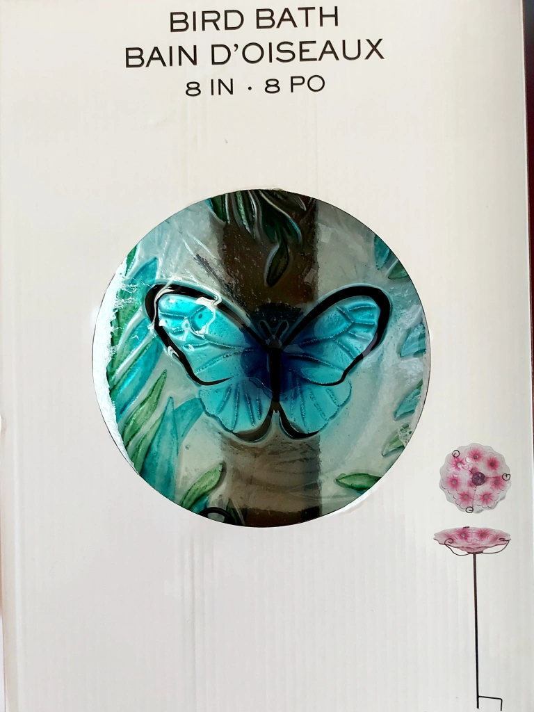 New Glass Butterfly and Flower Bird Bath Brand New in Box It features a colorful design with a prominent butterfly, crafted from glass. It serves as a water source for birds to drink and bathe. Size: 8 inches Store Price: $130