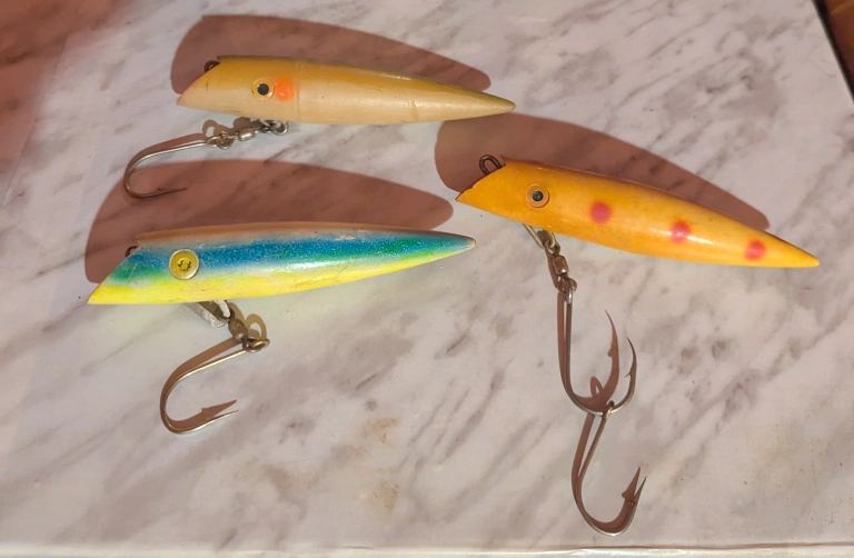 Selling a set of three fishing lures. They have a unique design and are ready for your next fishing trip! Great for catching fish in the lake or river, these lures are sure to attract some attention. vintage lured all 3 for one price $25