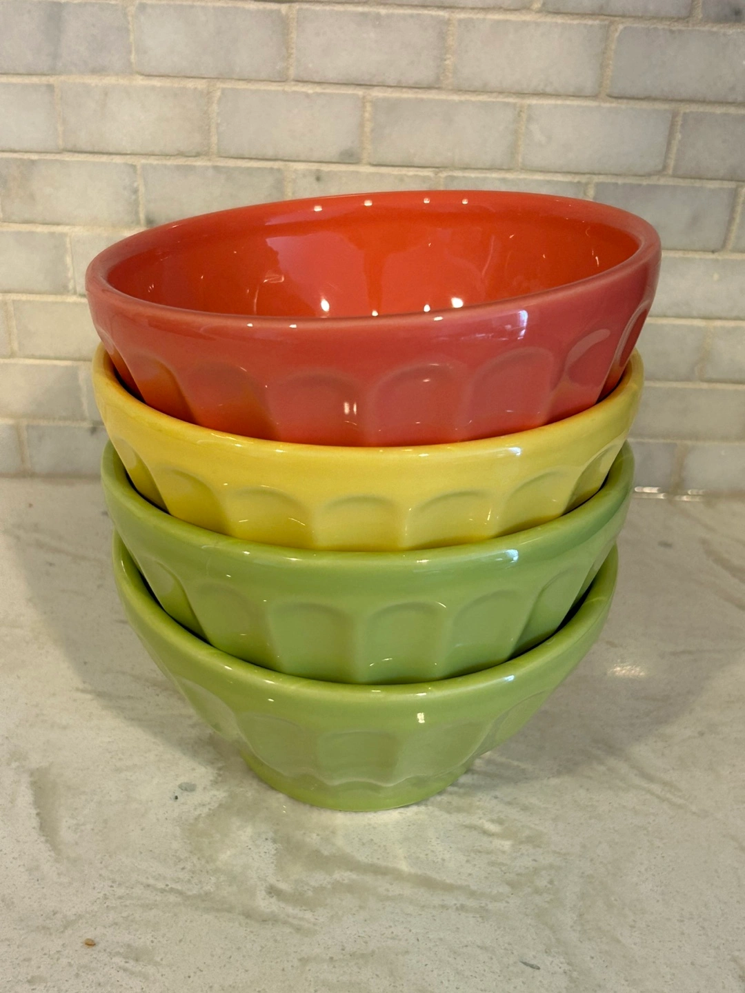 Selling a set of 4 cereal bowls! They're in great shape and ready for a new home. These bowls are made in Portugal and are both dishwasher and microwave safe. They come in a variety of colours: hot pink, yellow, and green. Perfect for adding a pop of colour to your kitchen!