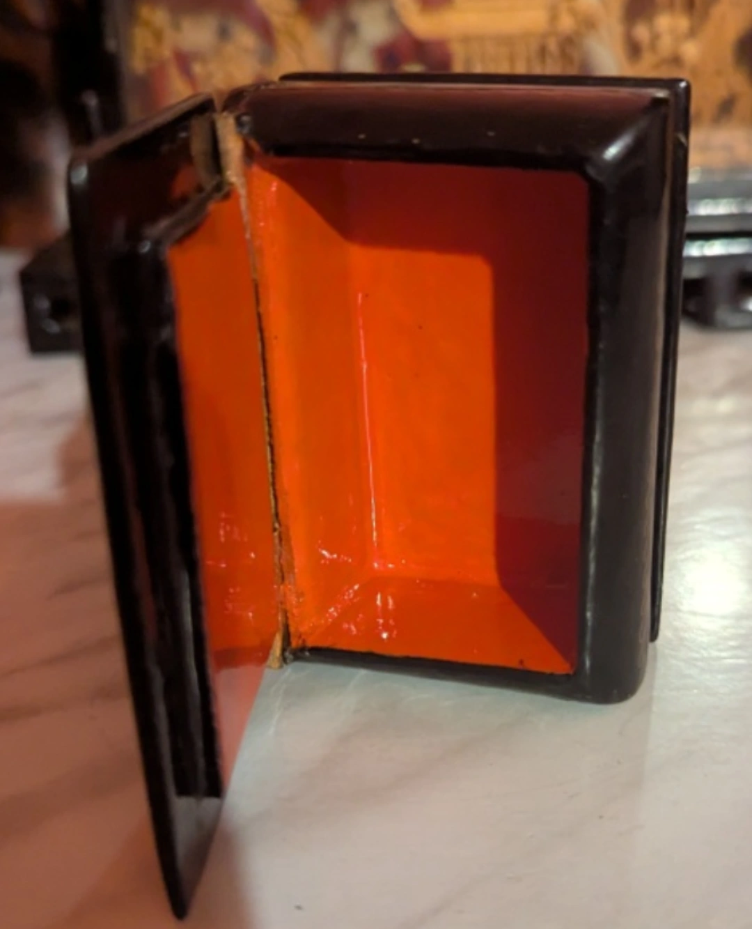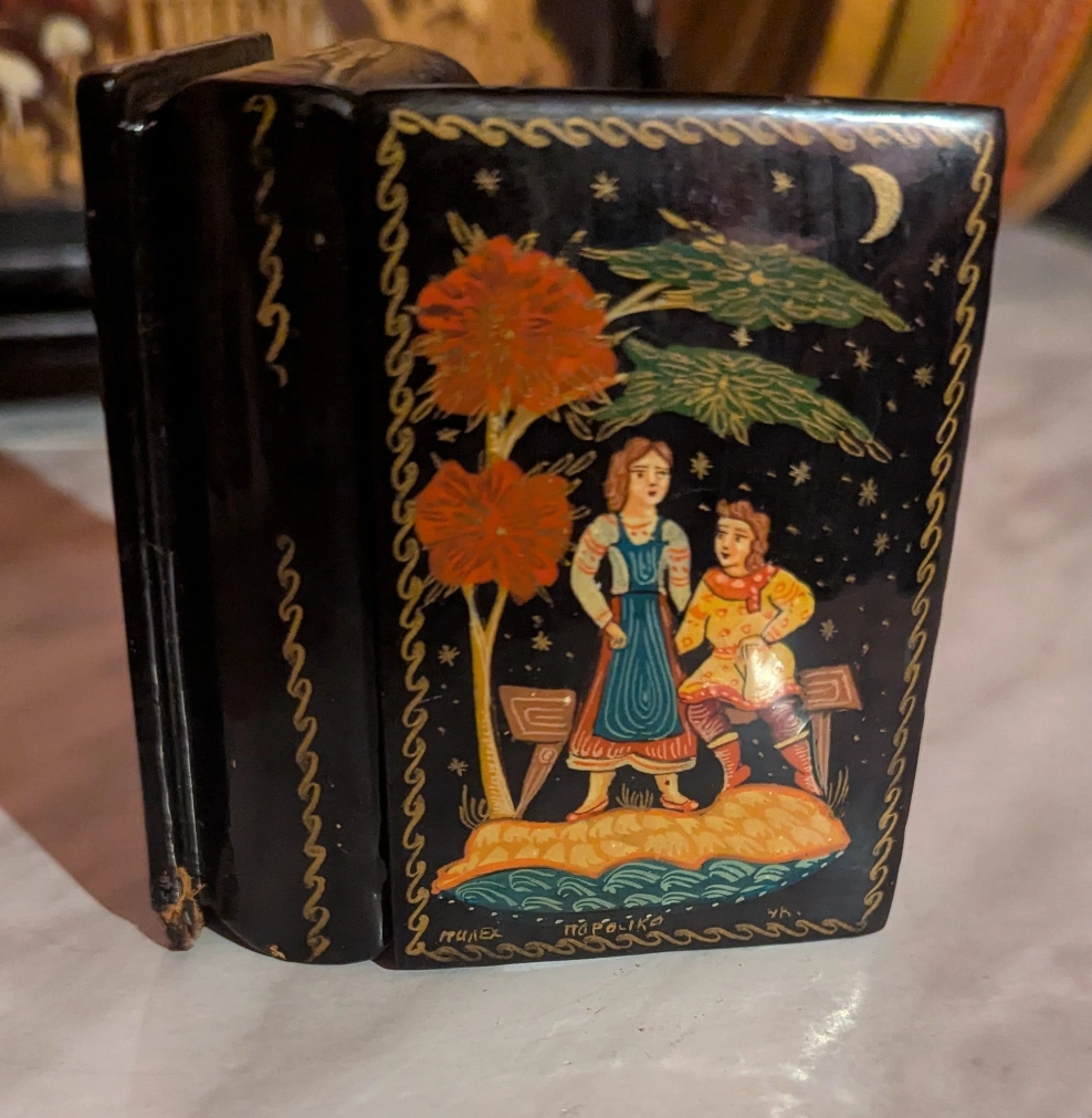 Selling a vintage Russian lacquer box. It features hand-painted scenes and intricate gold detailing. A unique piece for collectors or as a decorative item!