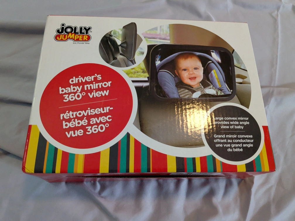 Brand New. Slight dent in box (see image). Someone got us an extra. Large convex mirror provides wide angle view of baby when baby is rear facing. Adjustable straps allow for easy installation. Retail price: $18+ Description: Jolly Jumper Driver’s Baby Mirror 360° View allows a driver to clearly view their little one while on the road; simply glance in the rear-view mirror to see your baby’s (adorable) reflection. Drive safely and confidently knowing that baby is safely secured in the rear facing infant car seat! This large shatter-resistant convex mirror easily attaches to the rear seat headrest and features an integrated ball-joint which pivots to adjust the mirror for best view (eliminating the need to fully remove the mirror to adjust).