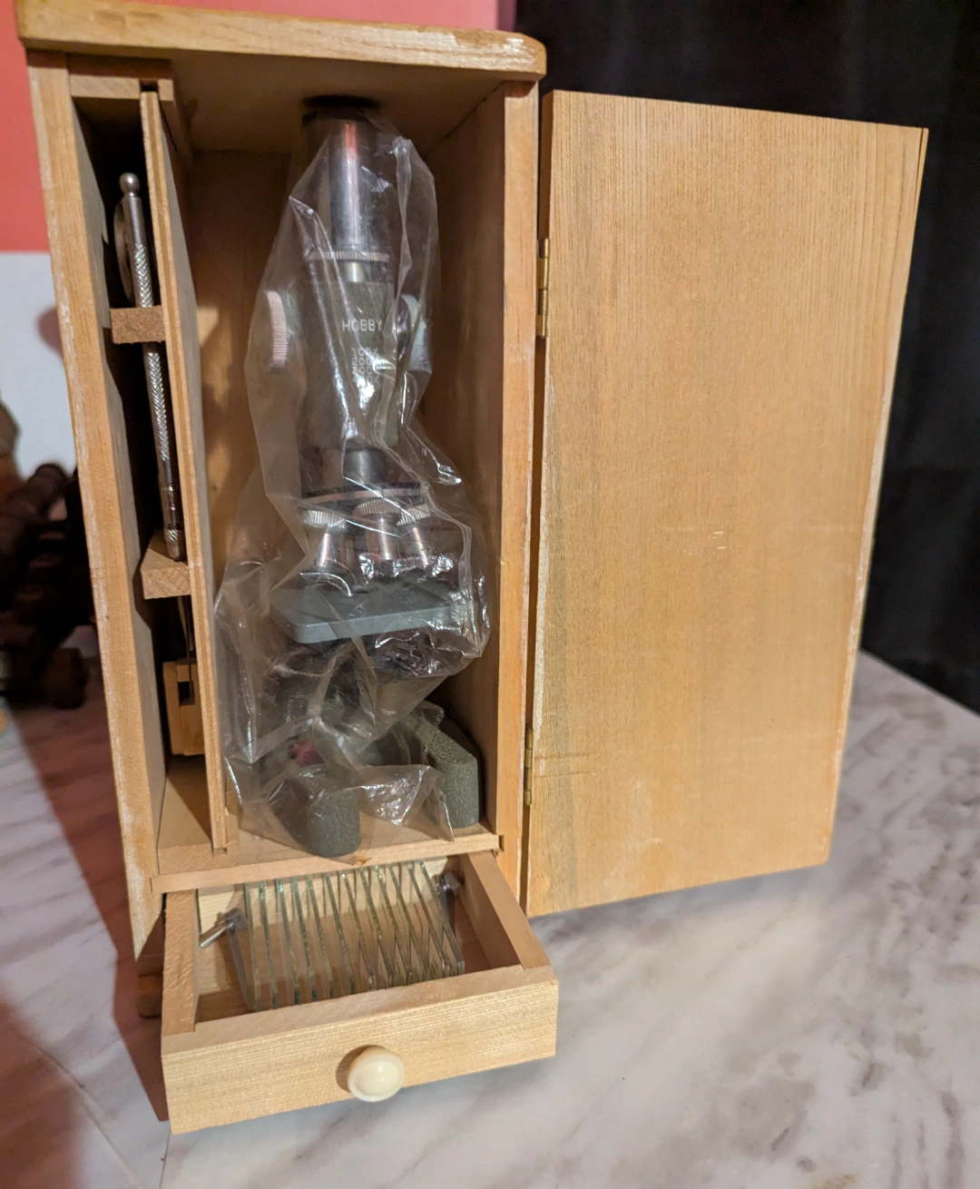 Selling a vintage Hobby microscope! It comes with its original wooden box and some accessories. A cool piece for collectors or anyone interested in microscopy! as is