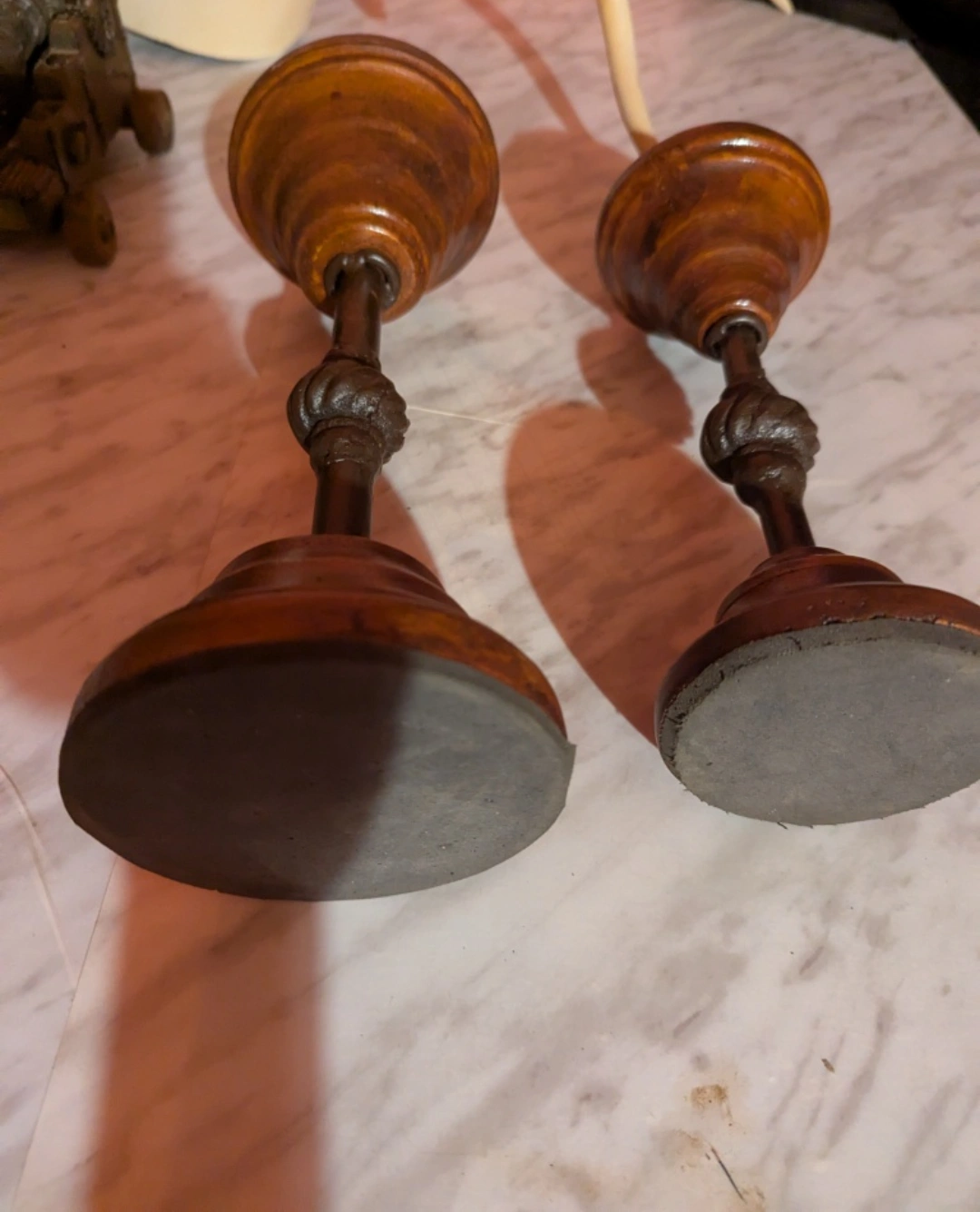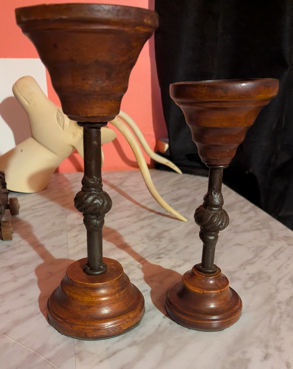Here's a set of two wooden candle holders. They have a lovely vintage look and would add a nice touch to any room. They are in good condition and ready for a new home