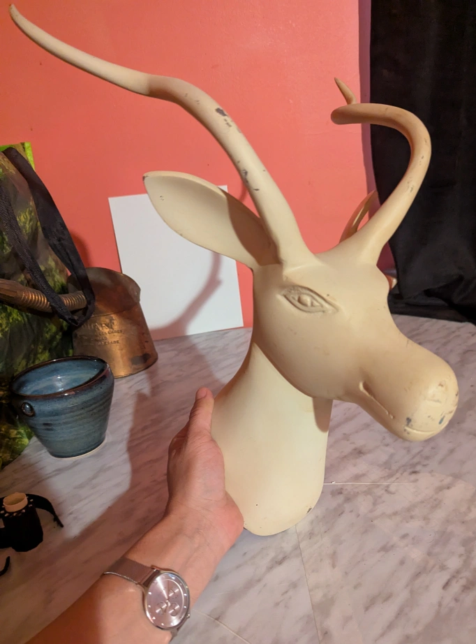 Selling a vintage deer head wall mount. It's a unique piece that would look great in a cabin or rustic-themed room. It has some signs of wear, which adds to its vintage charm! Perfect for adding a touch of character to your space