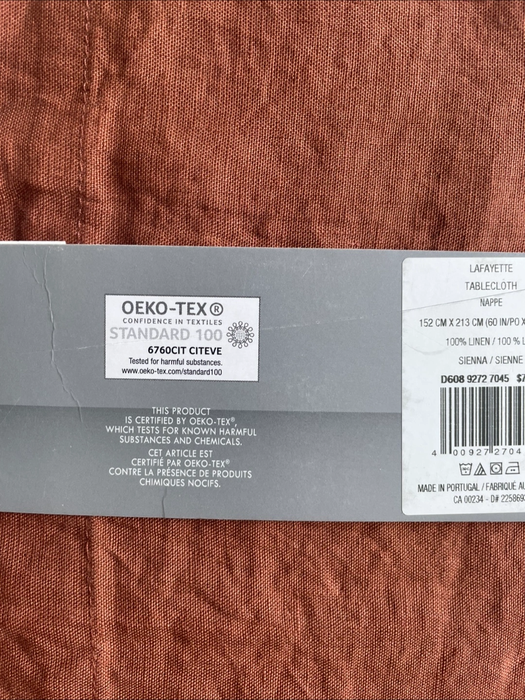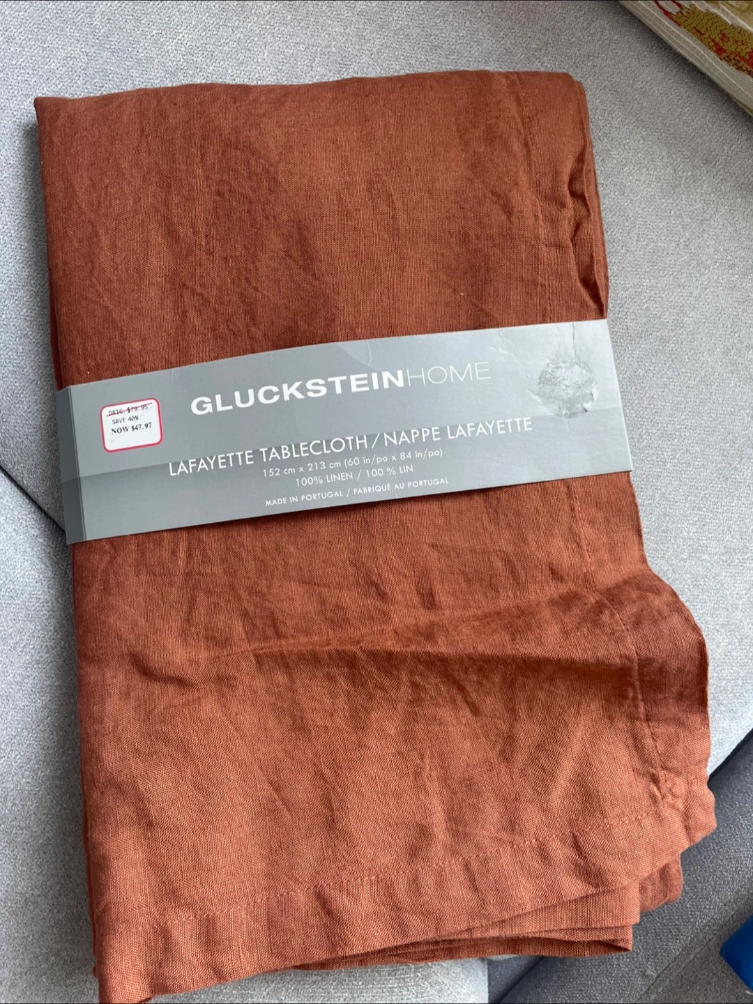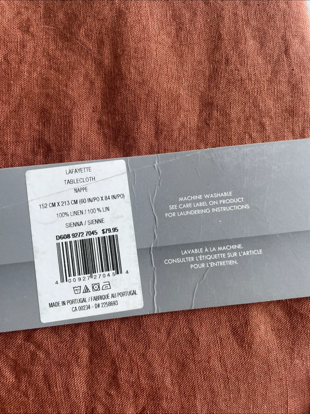 Selling a brand new GlucksteinHome Lafayette Tablecloth in Sienna (burnt orange) It's 152 cm x 213 cm (60 in/po x 84 in/po) and made of 100% linen. Originally price $50