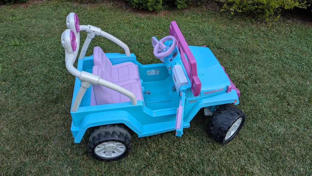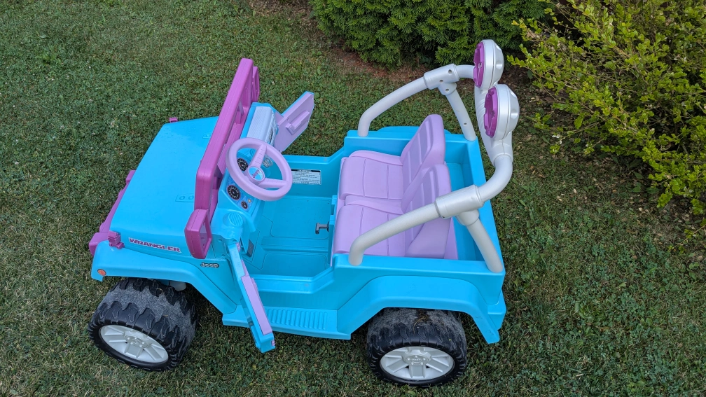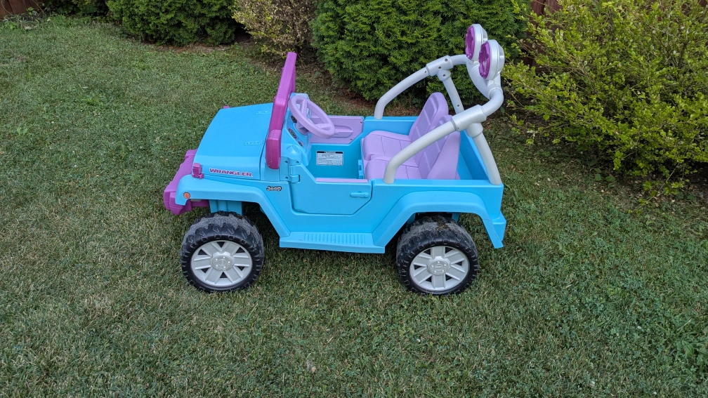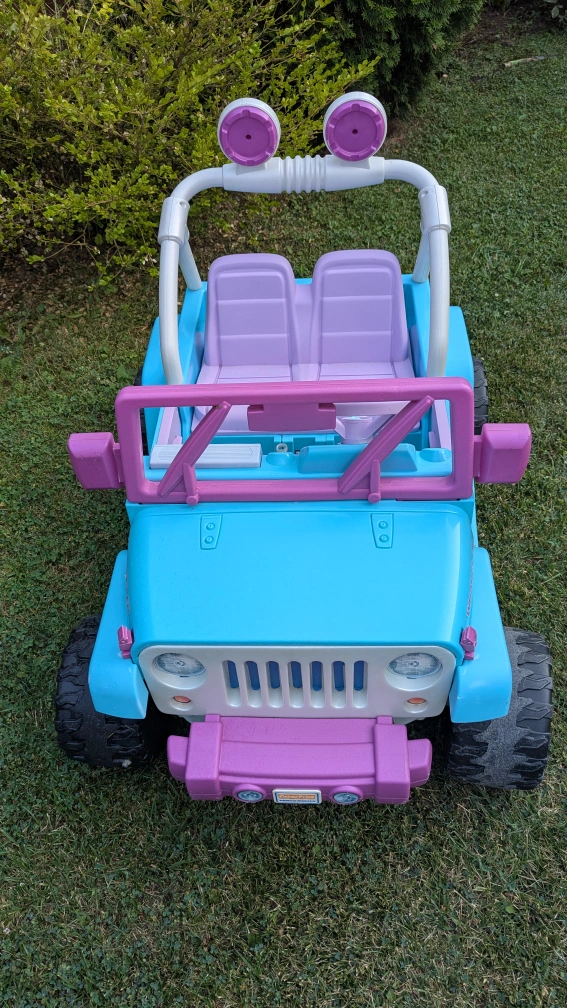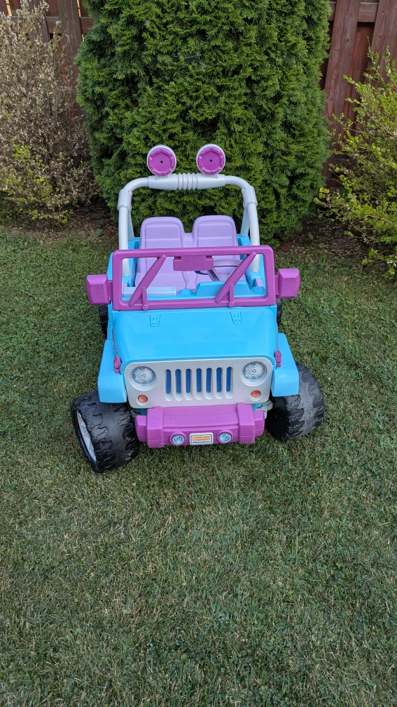 Power Wheels Jeep Wrangler in a cool blue colour scheme! This ride-on toy is perfect for who love adventure. It's a fun way to get around the yard or park. It shows some signs of use with a bit of dirt on the tires, but it's ready for its next adventure!
