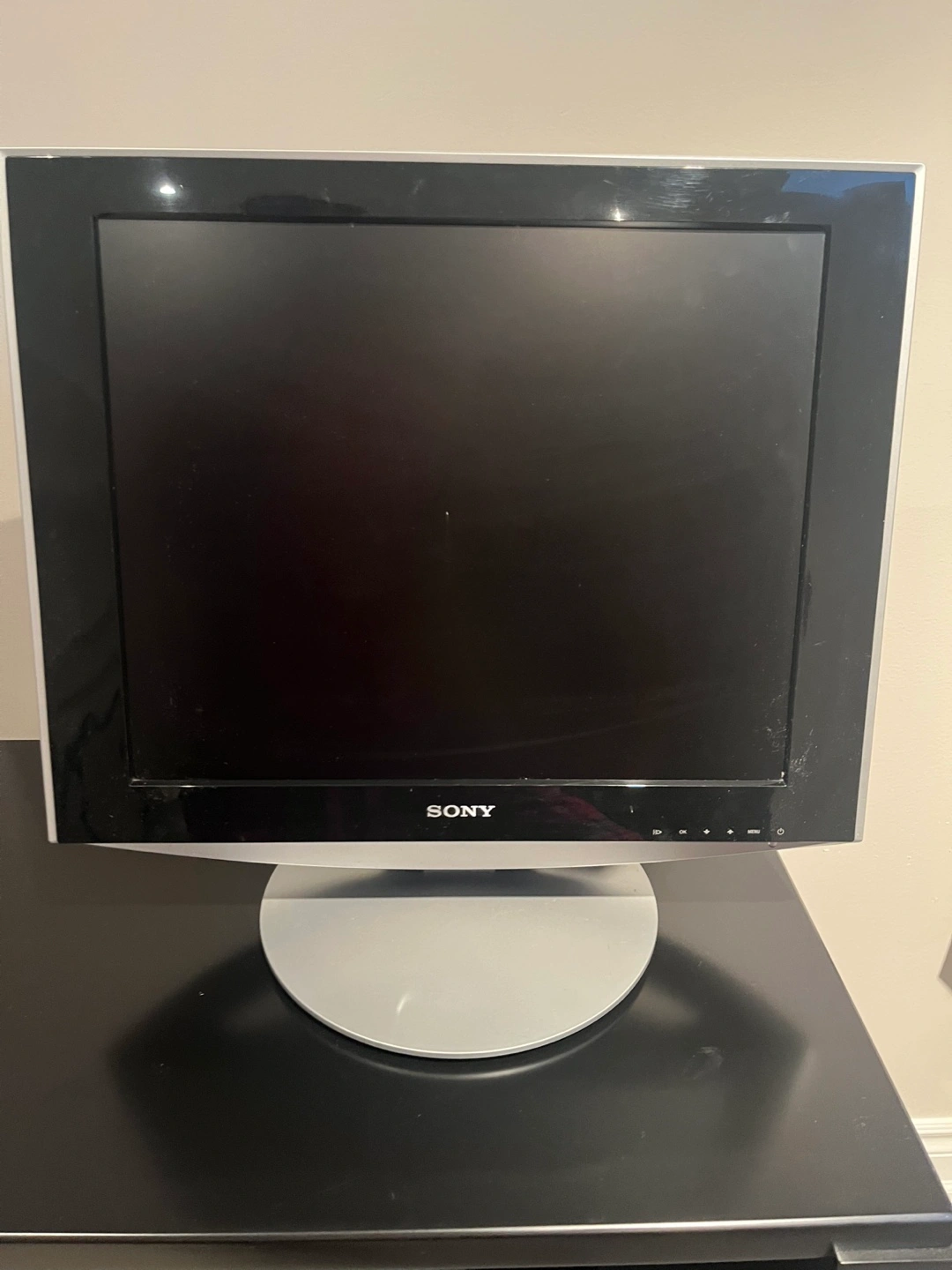 Selling a Sony computer display. It has a black frame and a silver stand. It's in good condition!