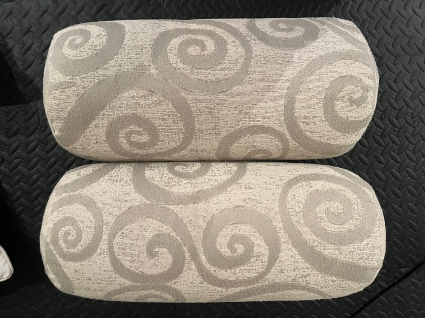 Selling two bolster pillows with a lovely swirl pattern! They're in great shape and would add a nice touch to any couch or bed. They're a neutral colour, so they'll match with anything!