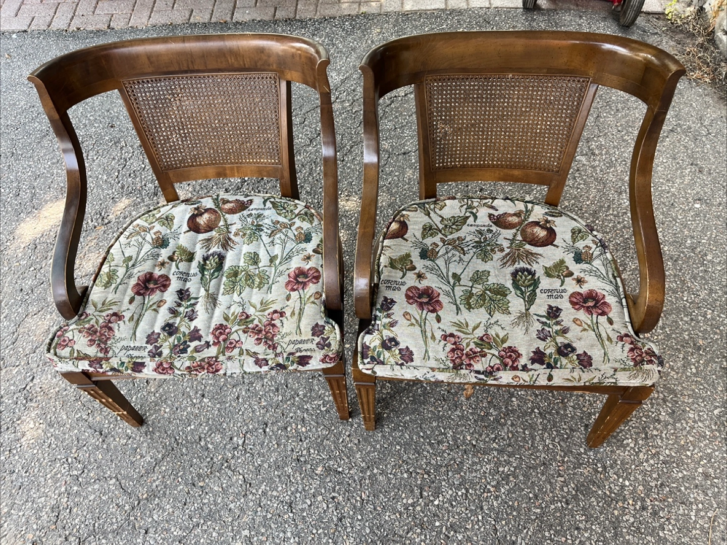Selling a pair of vintage chairs with a lovely floral upholstered seat. They have a wooden frame and a woven cane back. Perfect for adding a touch of vintage charm to your home!