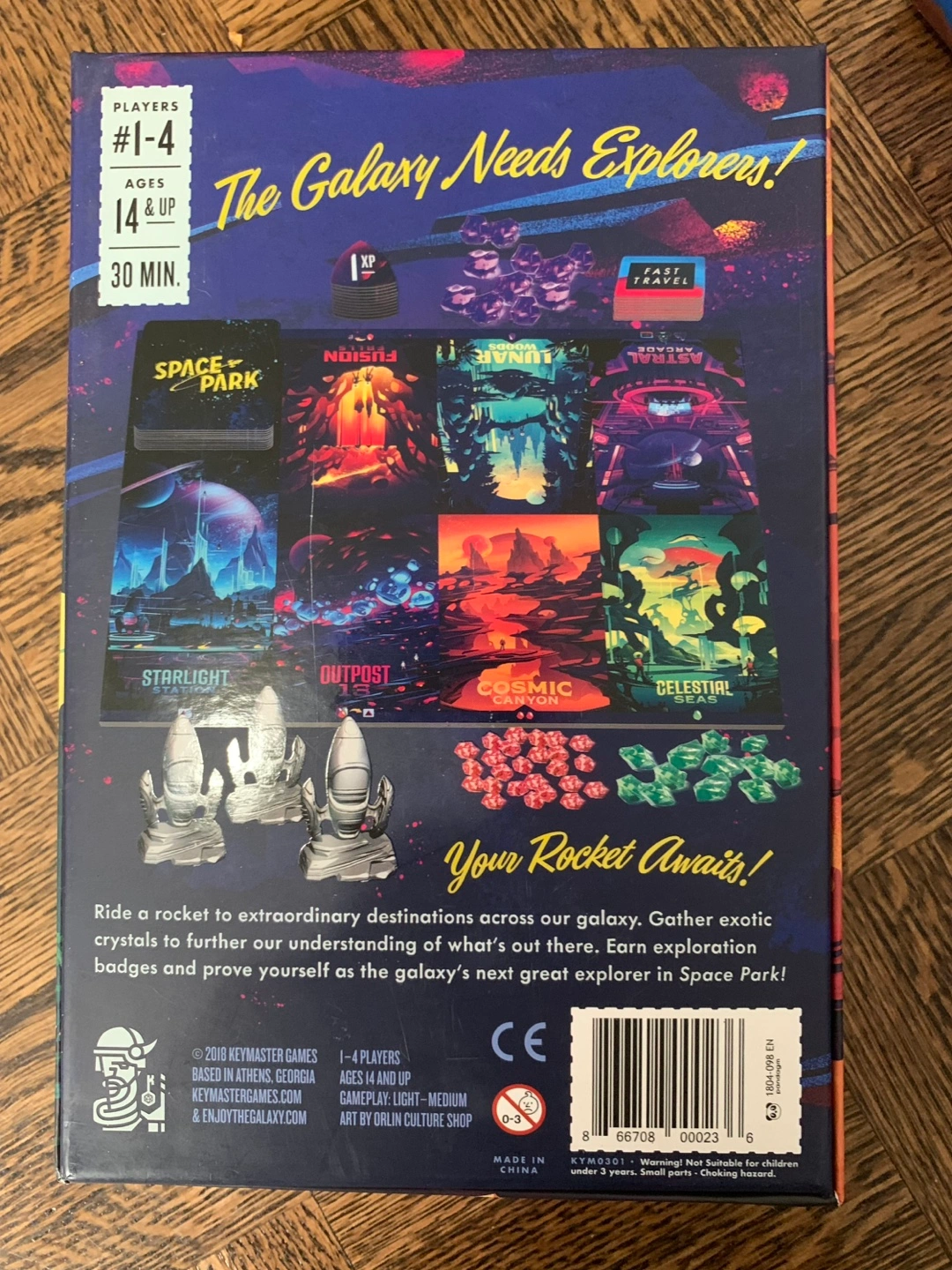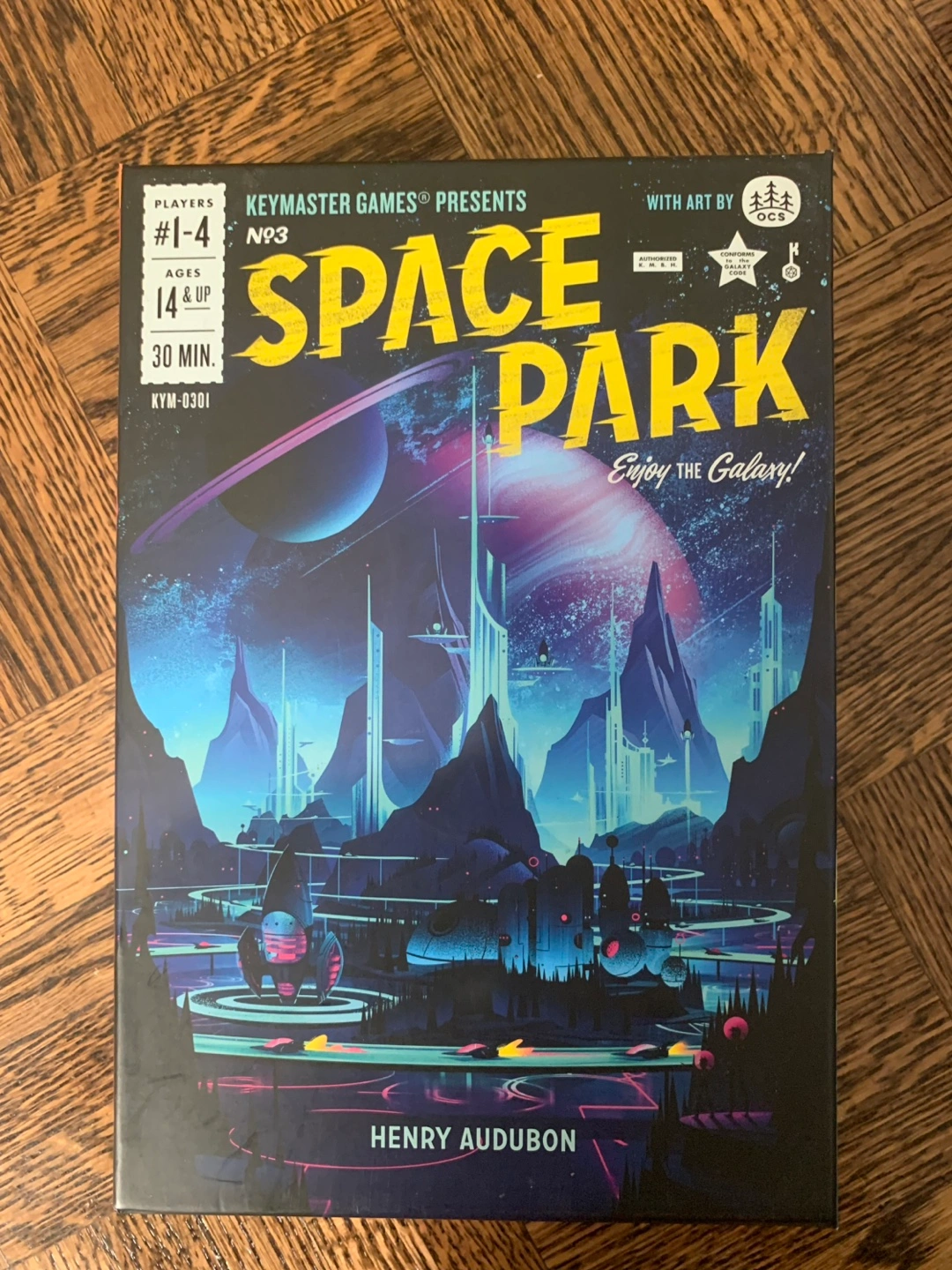 Selling the Space Park board game by Keymaster Games! It's for 1-4 players, ages 14 and up, with a playtime of about 30 minutes. Get ready to explore the galaxy and earn exploration badges in Space Park!