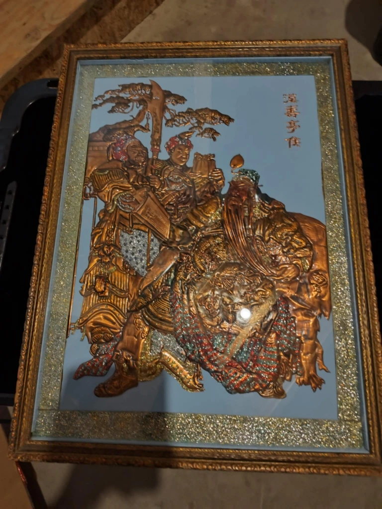 Here's a framed piece of metal artwork with Guan Yu (Guan Gong) and warriors It's a beautiful and intricate design that would look great in any home. The frame is gold-toned and the artwork features figures and a tree Height 22" Length 16" Thick 1.3 (3 cm)