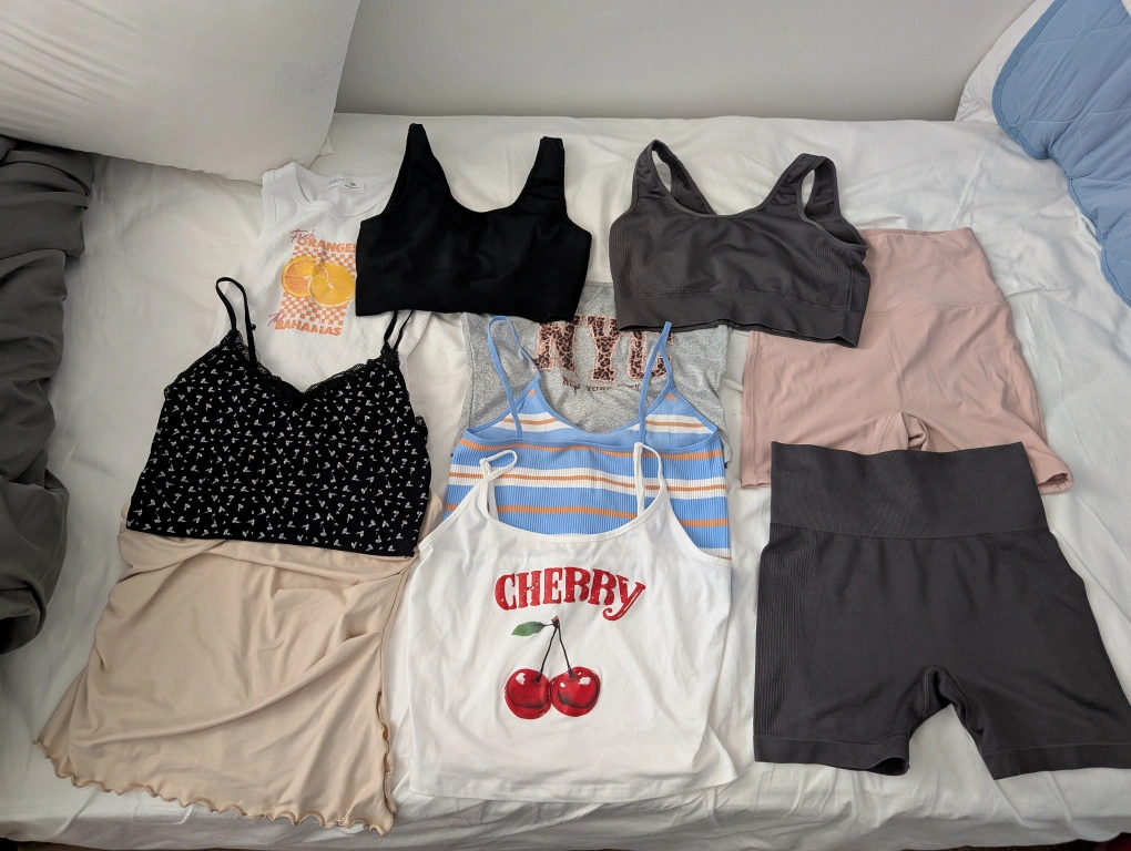 Women's clothes Tank Top Selling a mixed lot of women's tank tops and shorts! There's a variety of styles and colours, perfect for mixing and matching. Great for casual wear or workouts. Check out the photos to see the details! Tank Tops Bra Summer wear $3 each Buy more, save more All items have to go! Primark brand