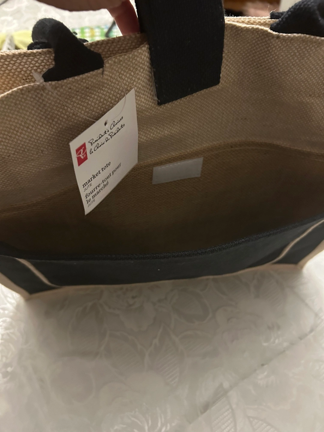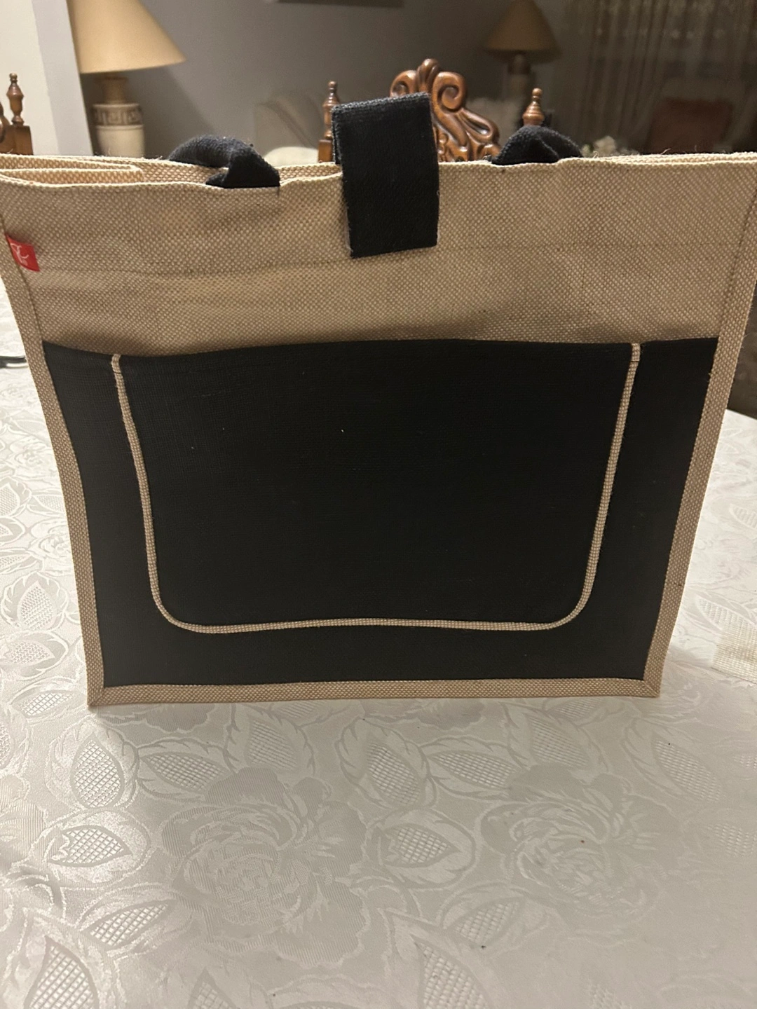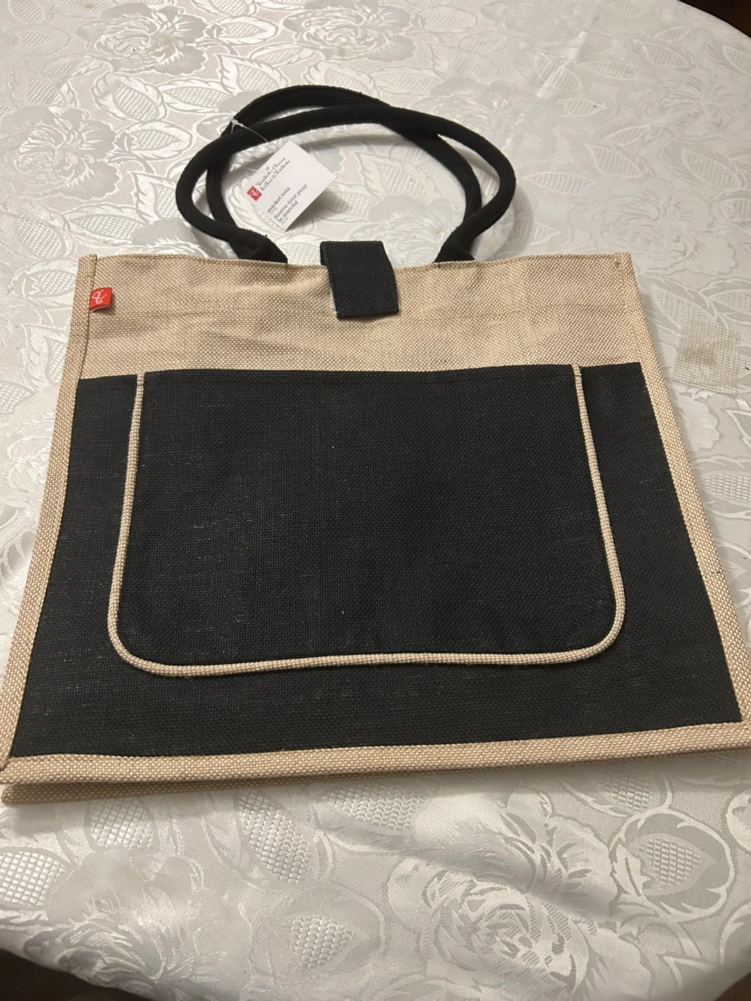 This President's Choice market tote is perfect for your next trip to the grocery store or farmer's market! It's made of jute and features a black pocket on the front and back . Very spacious inside , super durable.
