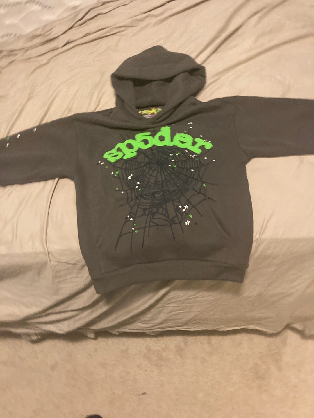 Selling a Sp5der hoodie in size S. It's made of 100% cotton and designed in the USA. The care instructions are: machine wash cold, tumble dry low. Do not bleach or iron