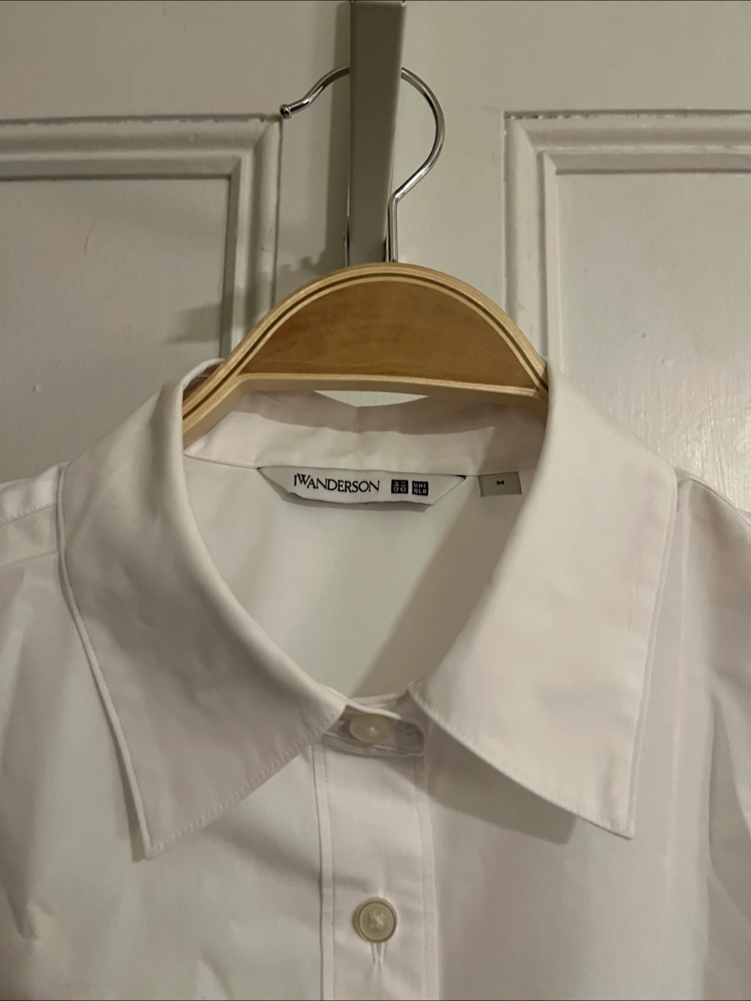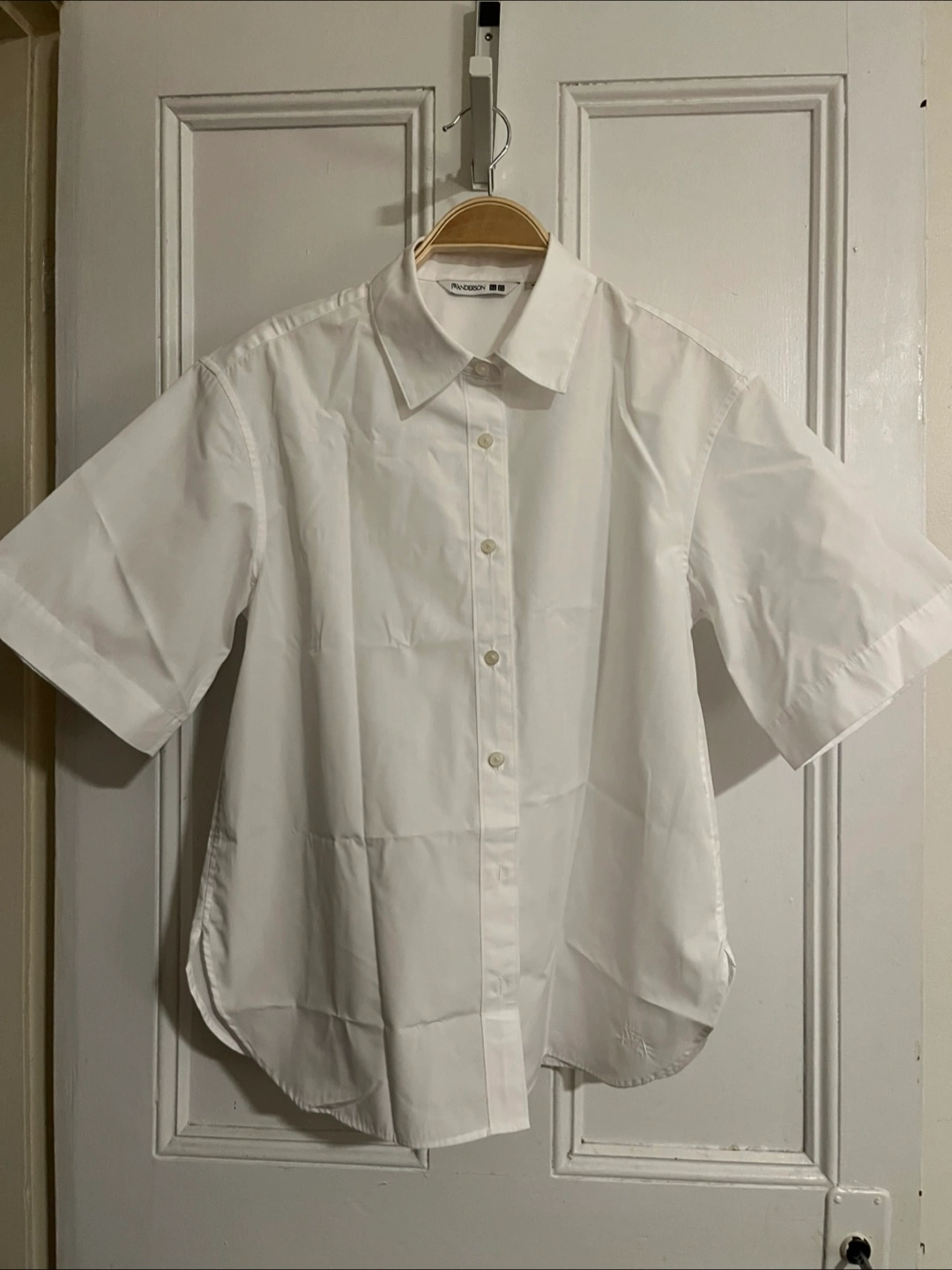 Uniqlo collab with British designer JW Anderson. Oversized button down with a larger than average collar for women’s shirting. Looks great over dressy bermuda shorts, culottes, and big pants. Super chic tucked into a high waisted pencil skirt. Also works with an a-line pleated skirt. The fabric is smooth to the touch yet feels crisp, too. Worn once for a special event. I’d say it fits women’s 8-12 depending on your preferences. Sorry it was folded so it looks creased! Note: I’m currently out of town and can either coordinate a drop off when I return or you can meet my partner on Friday/Saturday mornings.
